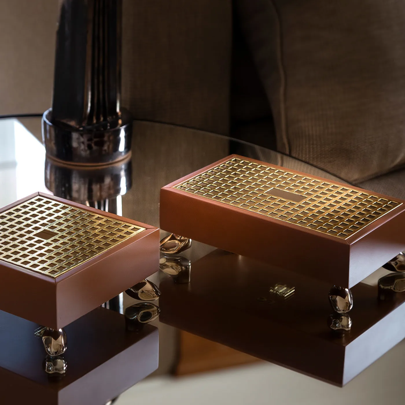 Questo raffinato cofanetto artigianale è una lussuosa dimora per piccoli oggetti e può fungere anche da vide-poche rialzata grazie al design a griglia del suo coperchio in ottone, preziosamente ispirato al pavimento della cattedrale dell’Arcidiocesi di Monaco. Il contenitore è composto da due scatole annidate l’una nell’altra, che rivelano una laccatura bianca all’interno e una calda laccatura marrone all’esterno della struttura in legno. I piedini metallici scintillanti, simili a ciottoli, completano il design.