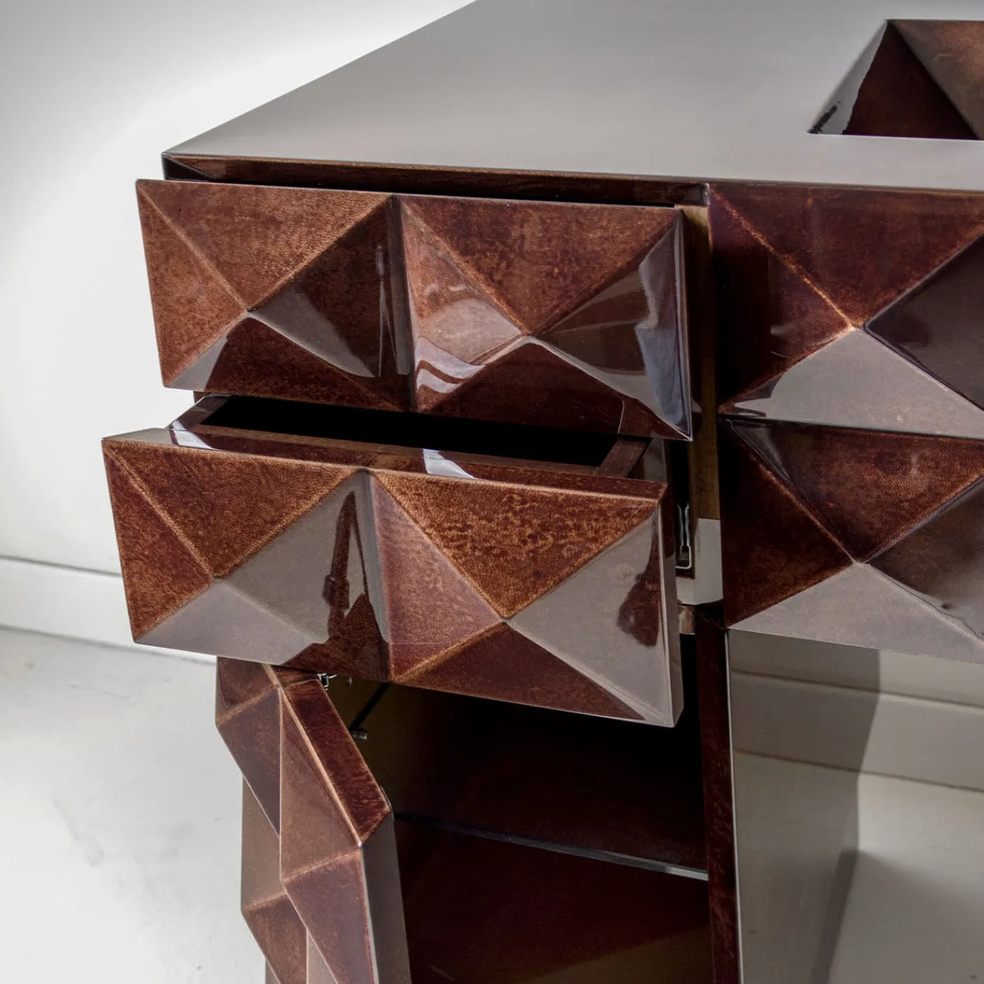 Questo raffinato insieme da bagno disegnato da Giannella Ventura è interamente realizzato in pergamena con una ricca tonalità moka. Realizzato per resistere ai rigori dell’umidità e dell’esposizione all’acqua, è sinonimo di durata e resistenza. Grazie ai cassetti e alle ante con apertura a pressione, la praticità incontra la raffinatezza senza sforzo. L’accattivante facciata frontale crea un’incantevole illusione ottica grazie a un intricato mosaico di piccole forme piramidali quadrate. Rubinetteria inclusa, come da immagine.