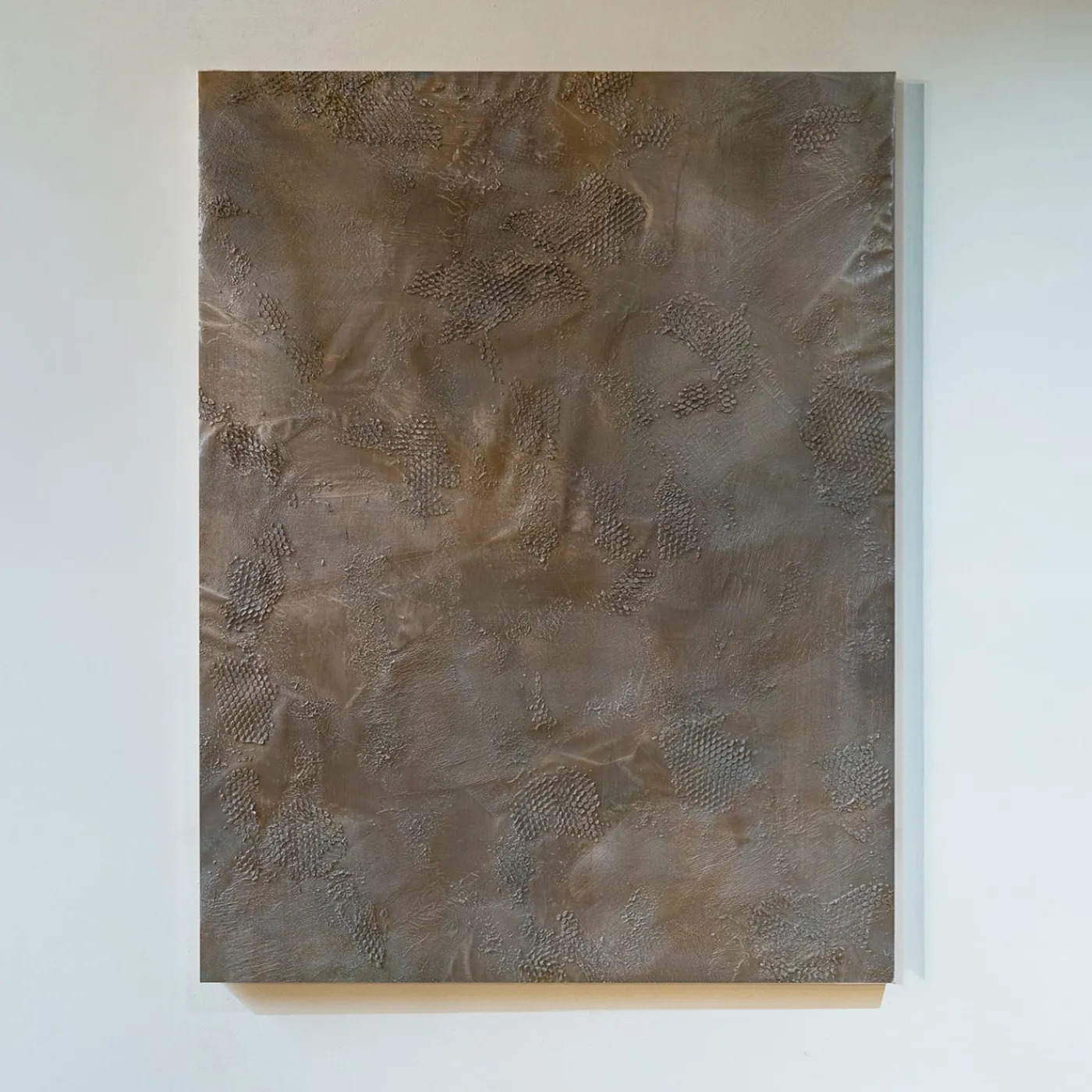 I materiali di questa carta intelata, stucco e juta, si fondono sulla tela per creare un’opera continuamente affascinante e misteriosa, dove emergono lampi di luce che accarezzano texture diverse che incuriosiscono l’occhio e il tatto.