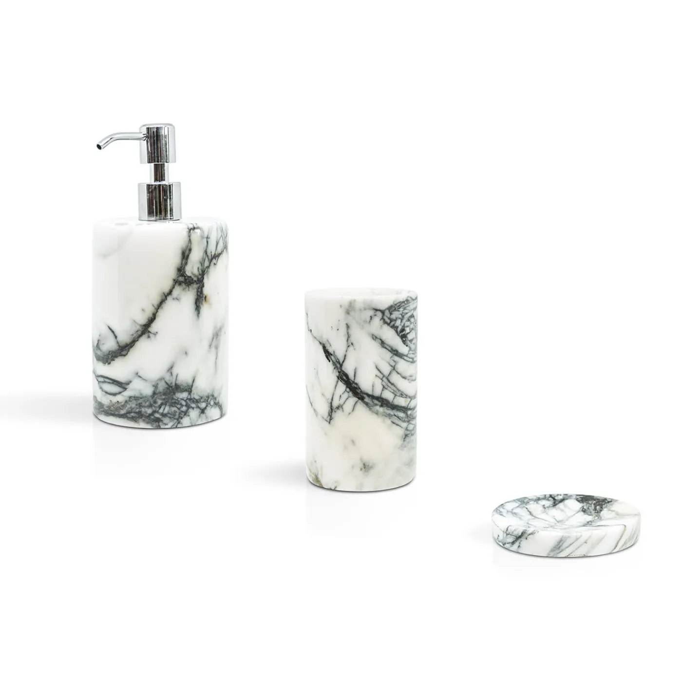 Un elegante e minimalista set da bagno in marmo, composto da un portasapone rotondo, un dispenser di sapone e il nostro portaspazzolino. Ogni pezzo di questo bellissimo set è interamente realizzato a mano da artigiani italiani. Grazie alle venature uniche del materiale, ogni pezzo è unico nel suo genere. Non lavabile in lavastoviglie; lavare con acqua e un sapone delicato e naturale.