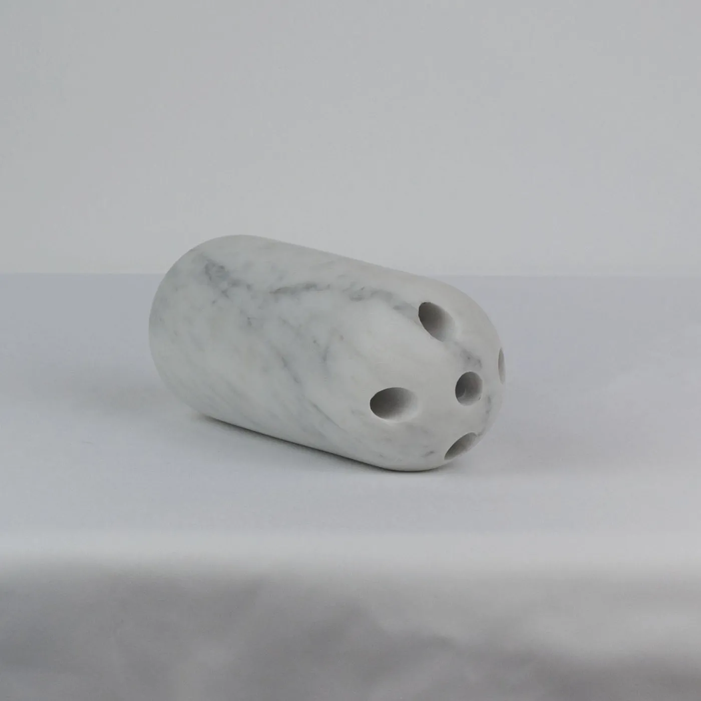 Capsule è un vaso in marmo bianco caratterizzato da una forma monolitica liscia e arrotondata con bordi smussati. I cinque fori che si aprono nella parte superiore sono pensati per accogliere gli steli floreali, ma al contempo può fungere da stiloso portapenne. Realizzato in marmo di Carrara con finitura satinata, questo vaso fonde semplicità ed eleganza sottile, enfatizzando la bellezza naturale del materiale e offrendo un impatto estetico versatile.