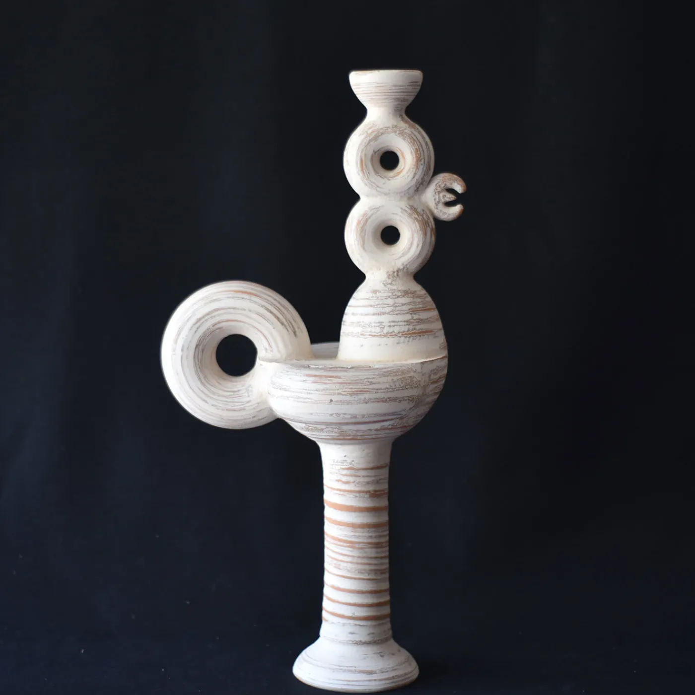 L’ispirazione zoomorfa di questa raffinata scultura in terracotta è un feroce gallo. Realizzata e modellata a mano al tornio, la silhouette stilizzata è ottenuta grazie a una sapiente combinazione di volumi rotondi, distribuiti in modo da rendere le specifiche parti del corpo dell’animale, ravvivandolo con un’intensa armonia scultorea. Lo splendido rivestimento è costituito da più strati di argilla liquida applicati sulla terracotta con la tecnica dell’ingobbio.