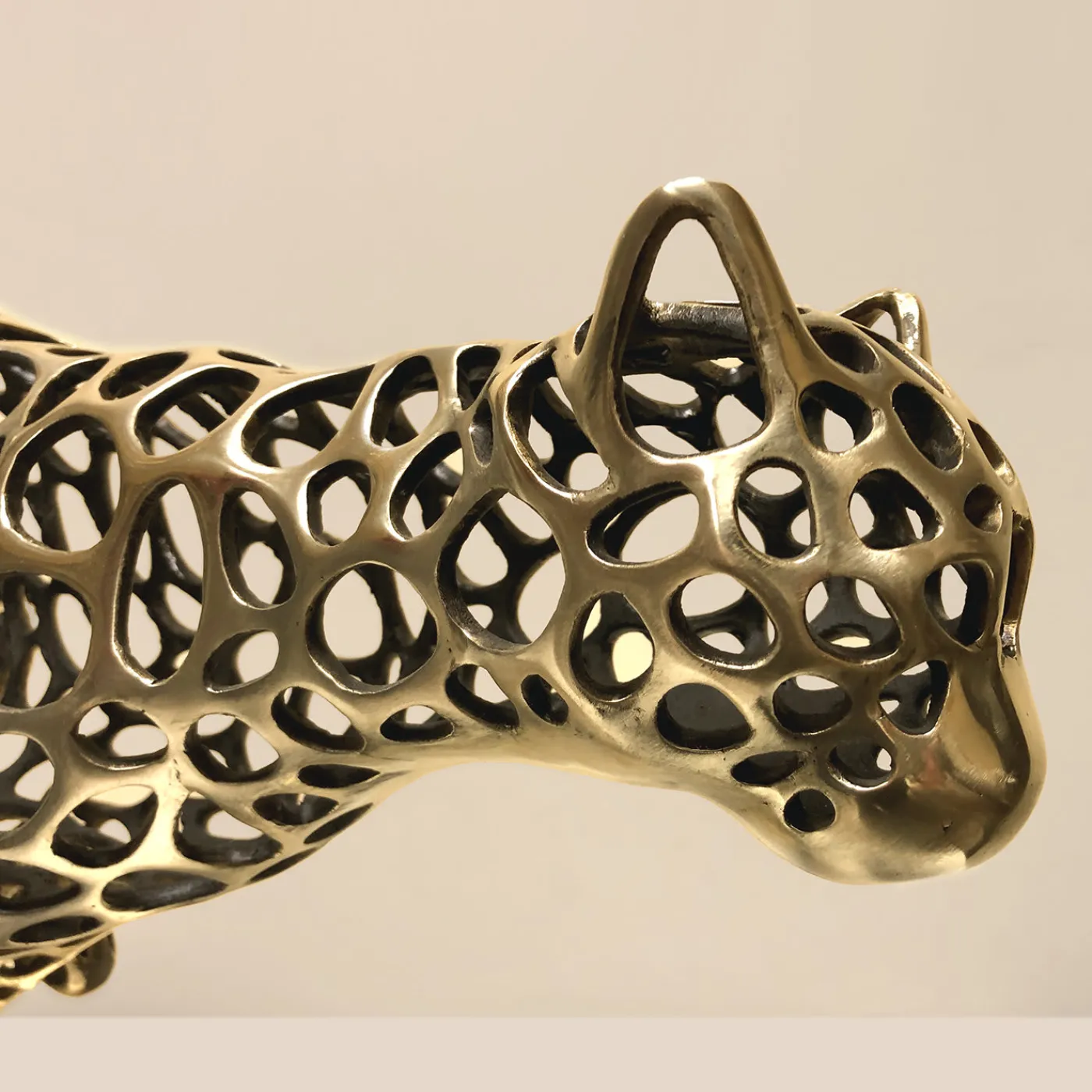 Questa splendida scultura raffigura un ghepardo in corsa, dal carattere feroce e veloce. Squisitamente realizzata in bronzo con la tecnica della fusione a cera persa, l’opera è caratterizzata da una serie di perforazioni che aggiungono leggerezza al senso di movimento del soggetto. Il bronzo è rifinito con un effetto brunito e specchiato che contribuisce al suo fascino moderno.