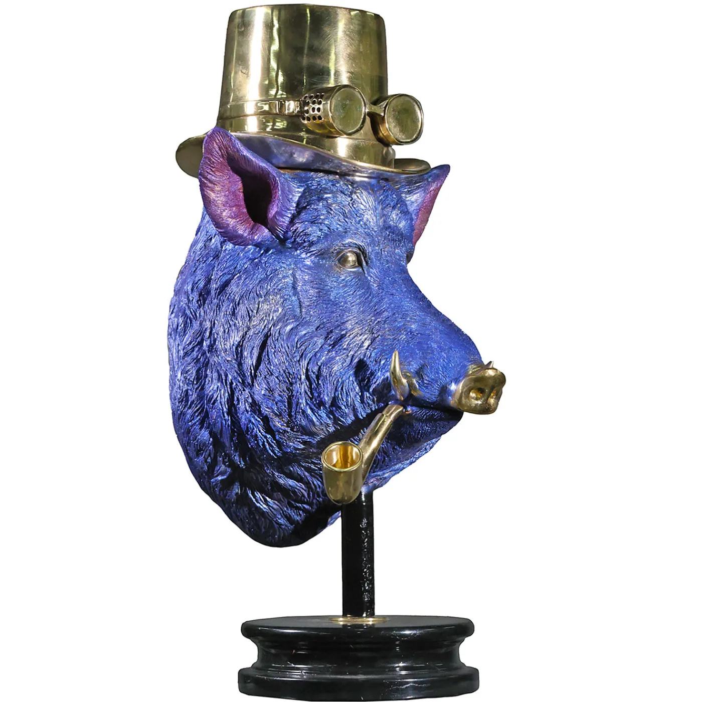 Scultura raffigurante la testa di un cinghiale, caratterizzata da una finitura distintiva e una texture dettagliata. Realizzato in bronzo con la tecnica della fusione a cera persa, questo elemento decorativo presenta un’accesa superficie blu e dettagli in metallo, tra cui un cappello a cilindro in stile ottone, un monocolo e una pipa. Montata su una base in marmo nero, aggiunge un tocco artistico e giocoso a qualsiasi ambiente.