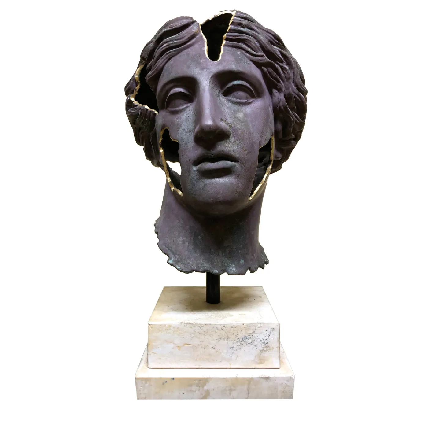 Il fascino solenne e statuario delle teste in bronzo è ravvivato in questa scultura da un tocco squisitamente glamour, grazie alla finitura dorata che accentua il perimetro dei fori rientranti. Un pezzo prezioso che si distingue per un’allure contemporanea discreta ma d’impatto, che rappresenta la testa di Venere incastonata in una base di marmo a gradini e realizzata con l’ausilio di patine verdi e viola per suggestive interazioni cromatiche.