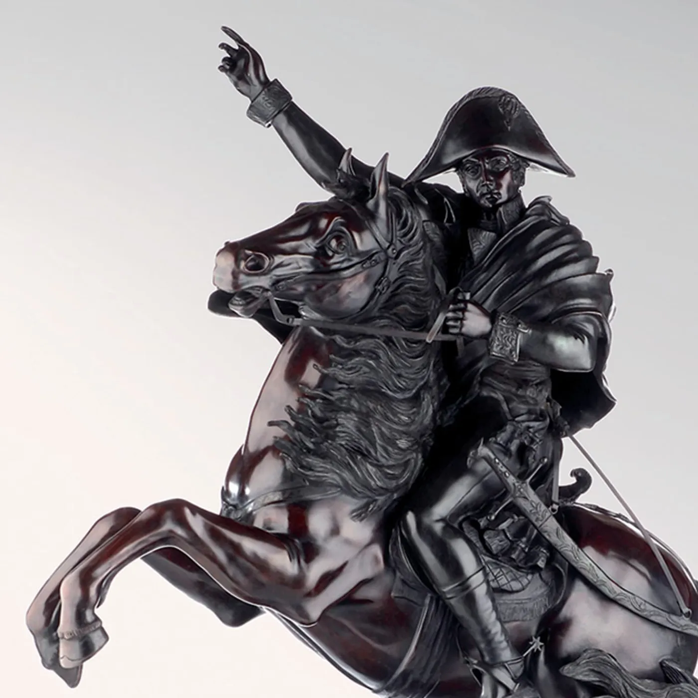 Questa statuetta di grande effetto ha un fascino decisamente classico, grazie alla squisita raffigurazione in bronzo di un cavallo rampante che sostiene un vittorioso Napoleone Bonaparte, che poggia su un elegante piedistallo in marmo ornato da una sofisticata decorazione e da piedi in bronzo con finitura oro francese. La statuetta aggiunge una nota di grandiosa eleganza a qualsiasi arredamento, rendendola un perfetto centrotavola o decorazione per una stanza elegante.