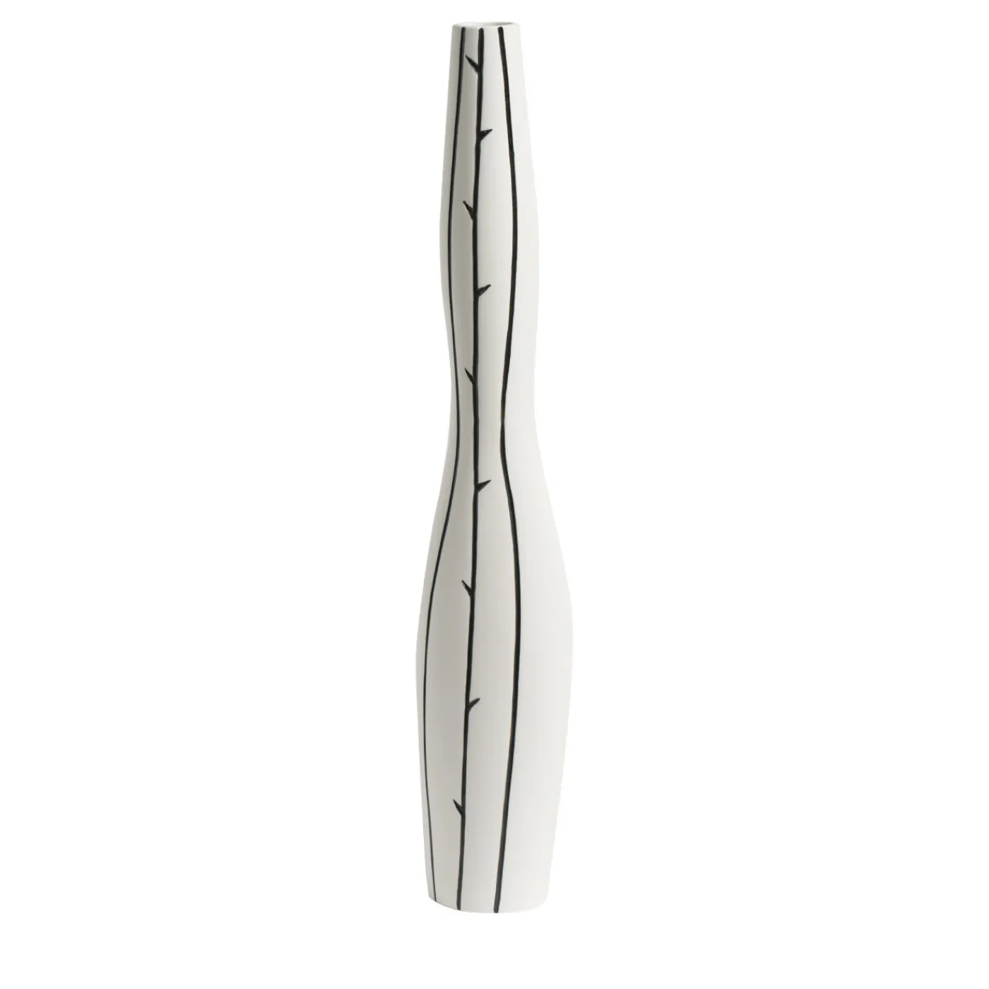 In questa raffinata bottiglia di porcellana, il design minimalista, ispirato a figurine antropomorfe, è in porcellana non smaltata, o “biscotto”, arricchito da suggestivi dettagli in nero che corrono verticalmente lungo la superficie del vaso come sinuosi rami di spine.