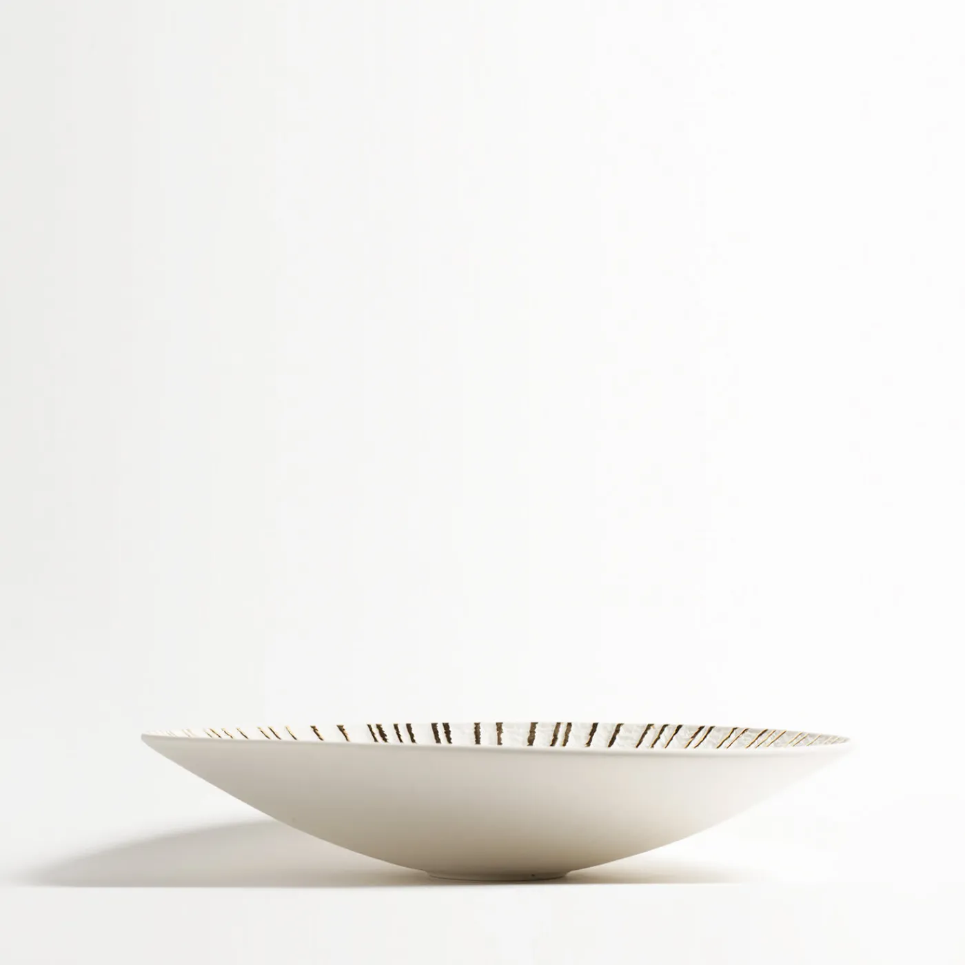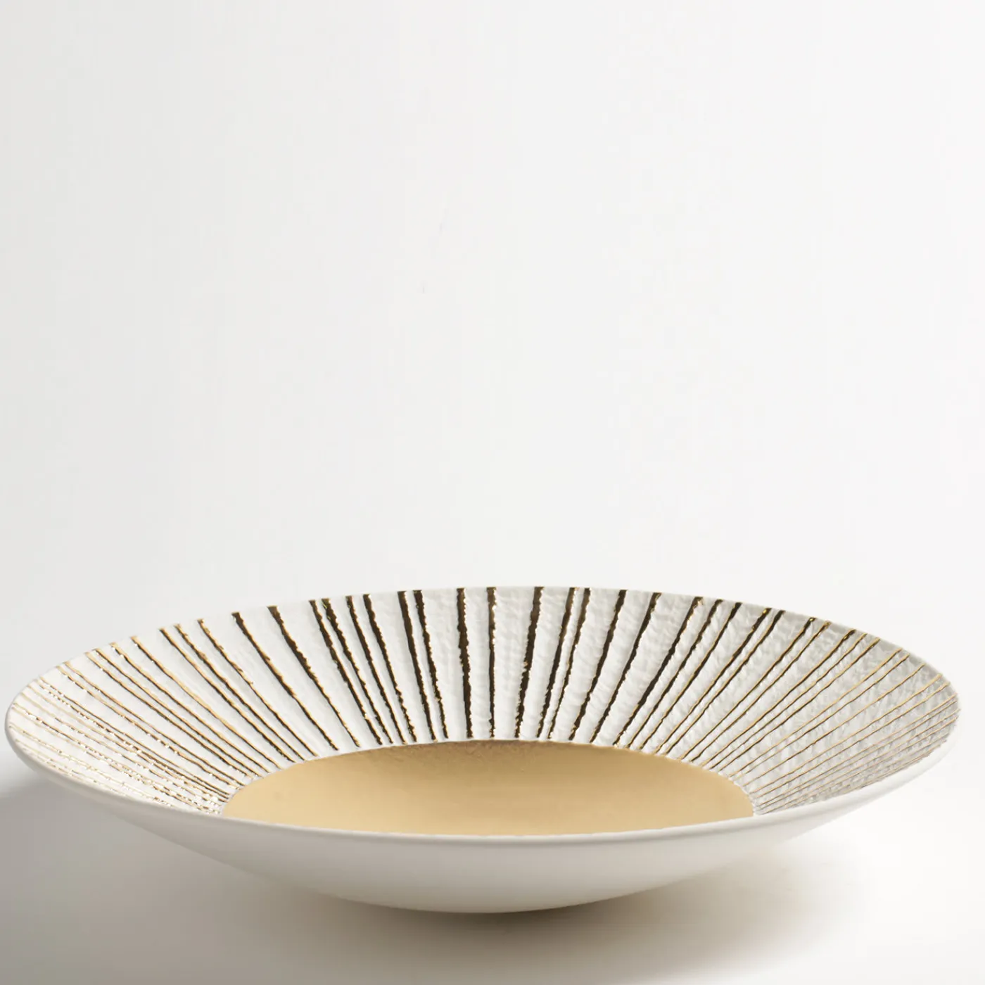 In questo squisito centrotavola in porcellana, l’elegante design è arricchito dalla presenza di un prezioso strato centrale di oro 23k applicato a mano che illumina la parte inferiore del pezzo e corre verticalmente in linee parallele verso il bordo, rendendo questo pezzo un sorprendente oggetto d’arte.