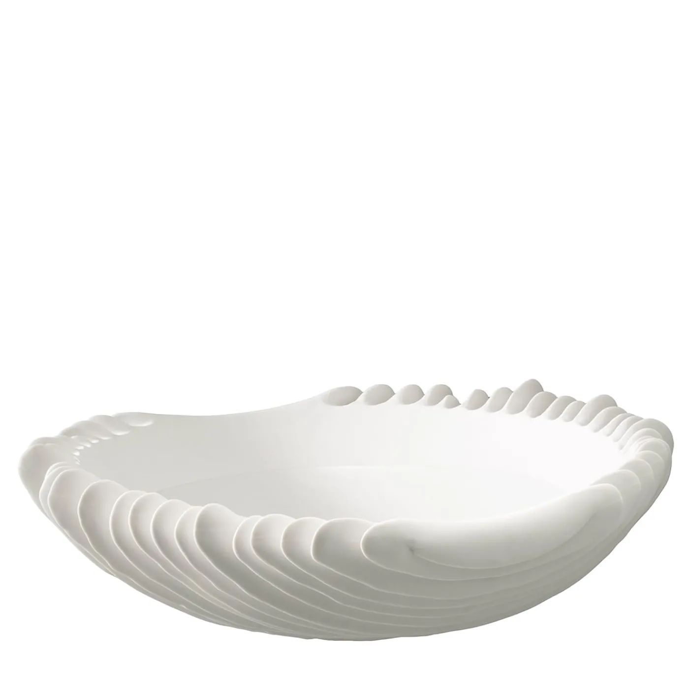 La superficie liscia di una conchiglia di porcellana bianca come la neve è costellata all’esterno da sottili fessure. Uno stampo meticolosamente realizzato e l’uso di porcellana non smaltata, o “biscotto”, rendono questo pezzo versatile uno squisito oggetto d’arte.
