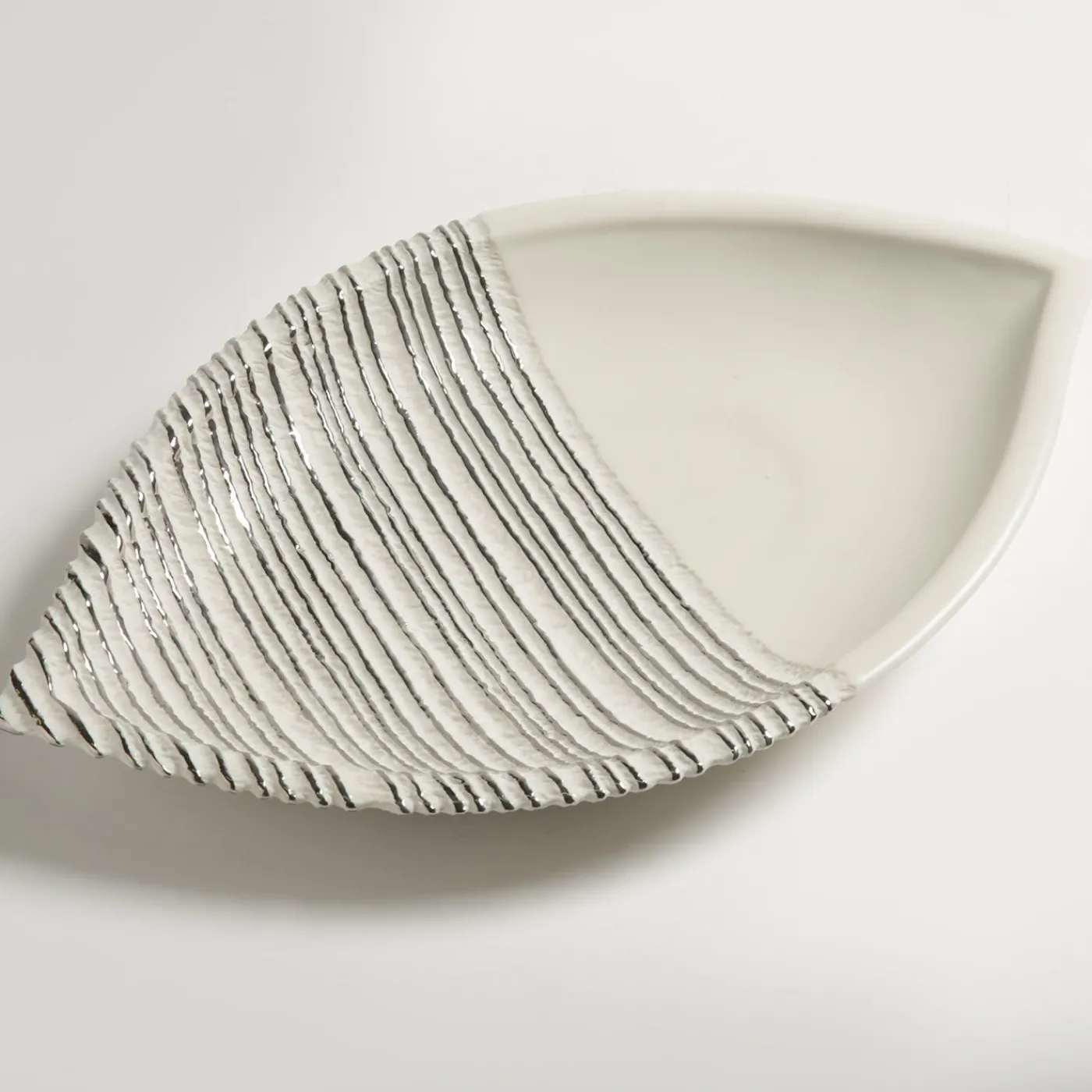 Questo squisito centrotavola in porcellana combina un design sinuoso con la preziosità degli accenti di platino applicati a mano che ne evidenziano la consistenza unica, rendendolo un sorprendente oggetto d’arte.