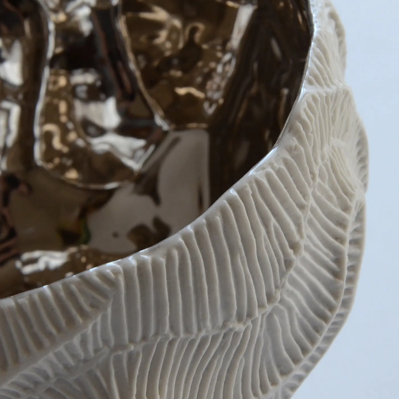 Ispirata ai fossili di madrepora, questa ciotola di forma ovale è un accattivante oggetto scultoreo. Lunghe e sinuose creste caratterizzano l’esterno in porcellana non smaltata di colore bianco conchiglia, la cui qualità tattile è ottenuta con la tecnica del “biscotto”. L’interno, di grande impatto visivo, è realizzato a mano con platino a 22 carati, con una finitura metallica che contrasta con il bianco deciso dell’esterno. L’interazione tra i colori contrastanti e le forme sinuose crea una composizione di grande effetto che aggiungerà un tocco di eleganza contemporanea a qualsiasi arredamento.