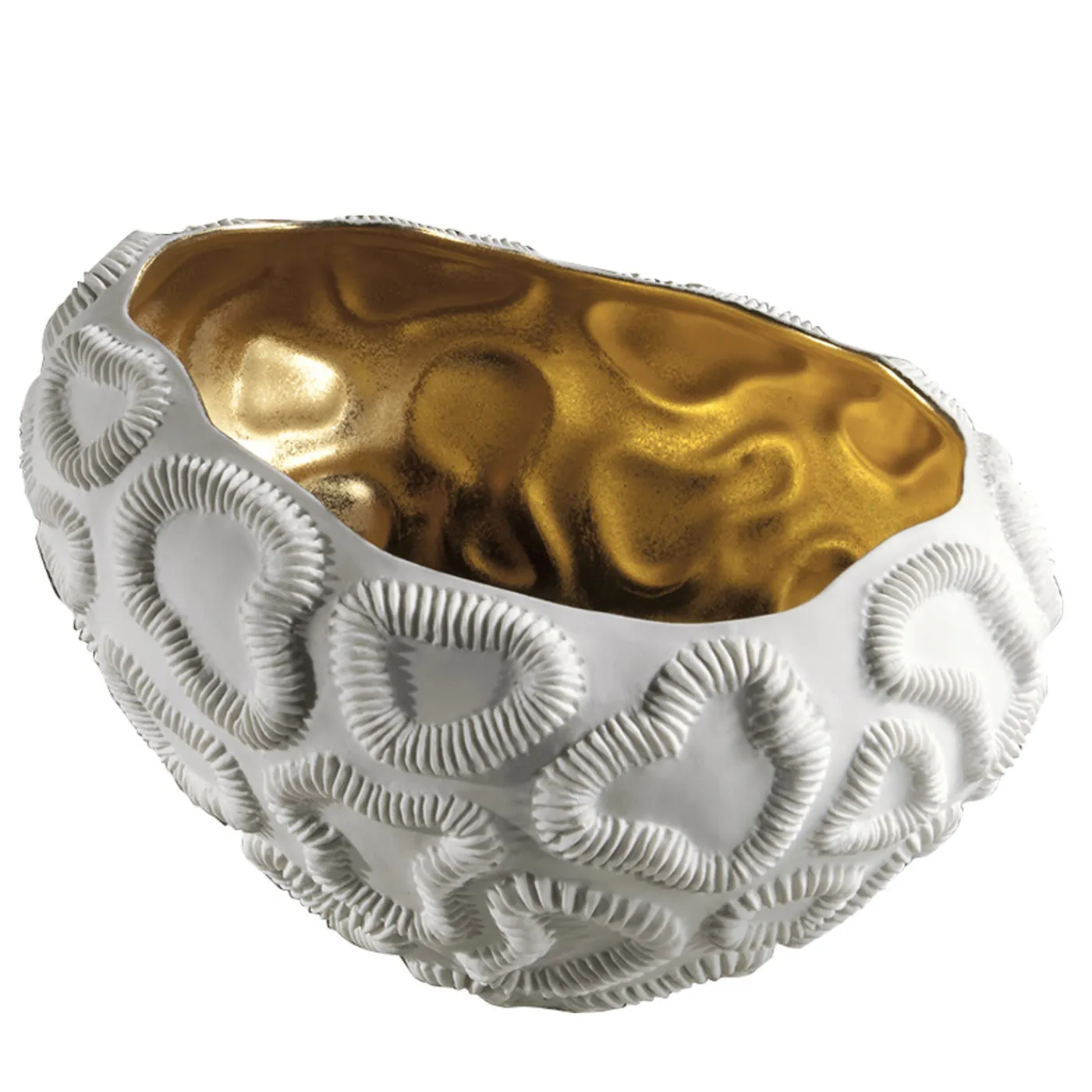 Ispirata ai fossili di madrepora, questa squisita ciotola di forma ovale fonde l’artigianato tradizionale con un’estetica moderna e audace. L’esterno, di colore bianco conchiglia, presenta motivi circolari di forma irregolare con creste testuali, che evocano la superficie dei coralli fossili. La finitura tattile dell’esterno, realizzata con porcellana non smaltata attraverso un processo noto come “biscotto”, contrasta con l’interno della ciotola, decorato con uno strato d’oro 23kt applicato a mano per un effetto visivo sorprendente. Una mensola bassa, un tavolino da caffè o un tavolino laterale sono la migliore vetrina per quest’opera dinamica.