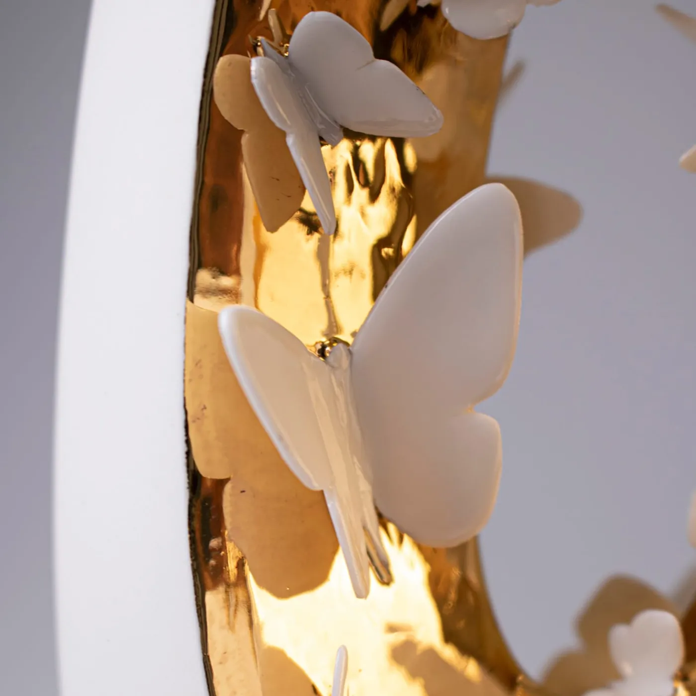 Questa coppia di vasi in porcellana è una rappresentazione ironica dell’amore e del suo sintomo più noto, le “farfalle nello stomaco”. L’interno (lo stomaco) di questi vasi antropomorfi mostra una moltitudine di farfalle che danzano nei bagliori dell’oro 23k. Ogni farfalla è diversa dalle altre perché sono completamente fatte a mano, una per una, rendendo questi vasi delle vere e proprie opere d’arte. Il prezioso oro viene applicato a mano e fissato attraverso un ulteriore e meticoloso processo di cottura. Le dimensioni dei 2 vasi sono nello specifico: 19x11x58 cm e 15x9x58 cm.
