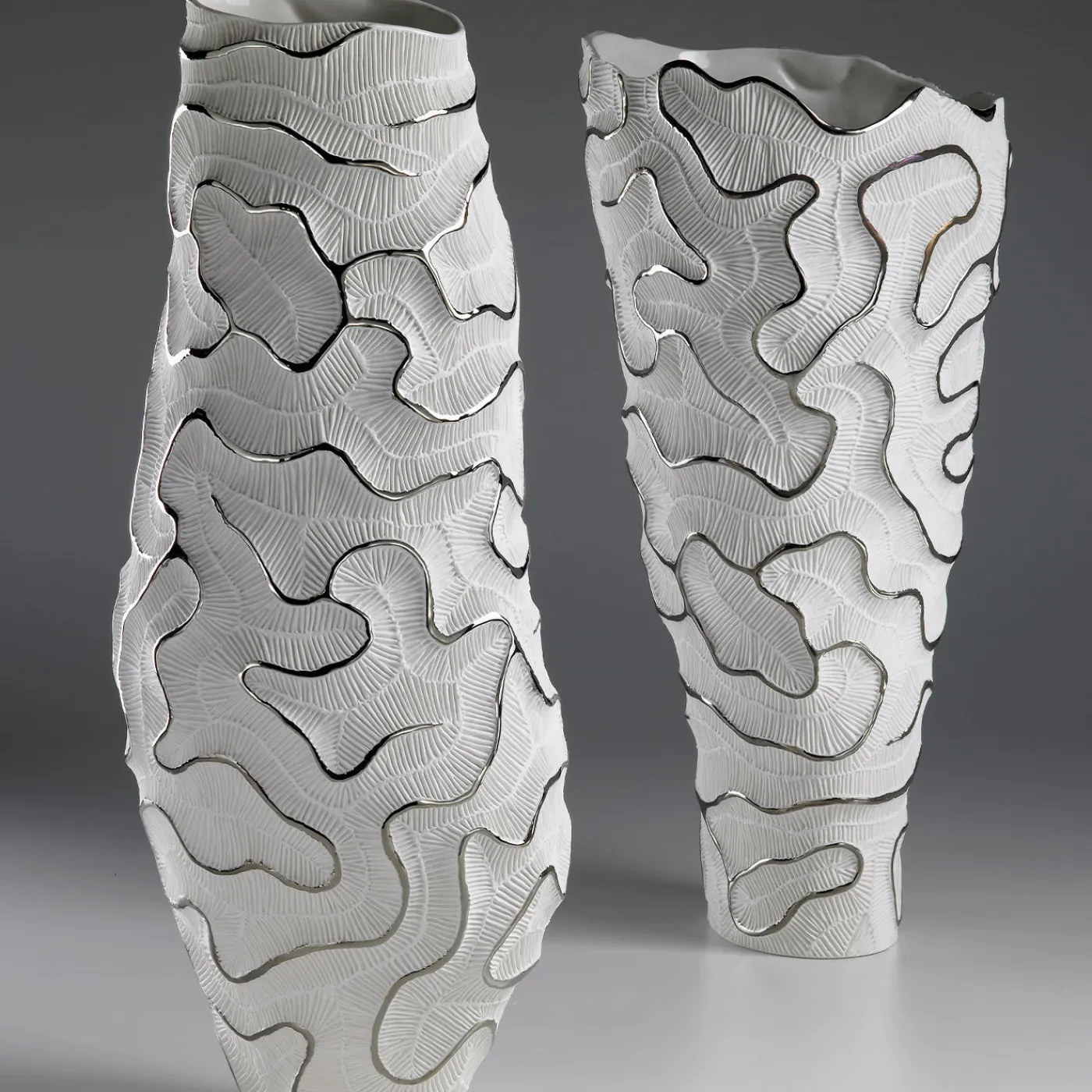 Una trama fitta e intricata, che rimanda ai fossili di madrepore, fa da scheletro a questo vaso della collezione Fossilia. Caratterizzato da una bella composizione, dalla perfezione delle forme e dall’accuratezza dei dettagli della porcellana non smaltata, il vaso è impreziosito dall’uso del platino, applicato a mano e fissato tramite un ulteriore processo di cottura.