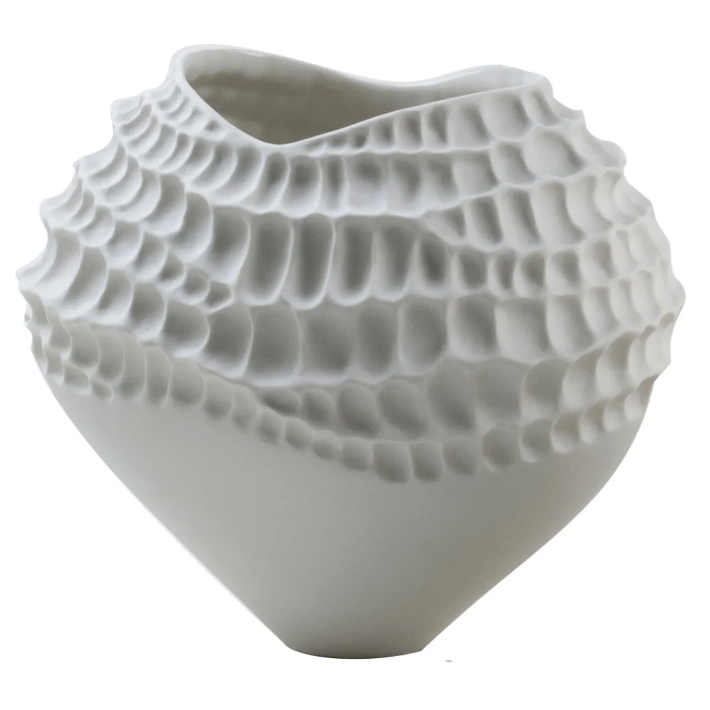 La particolare forma ellittica e la superficie strutturata che ricorda una martellata sono il risultato di uno studio meticoloso al microscopio di un seme. L’attenta e accurata preparazione del modello permette di apprezzare il gioco di luci e ombre sul corpo bianco scolpito. Questo elegante vaso, in porcellana bianca non smaltata, nota anche come “biscotto”, valorizza l’aspetto di qualsiasi interno.