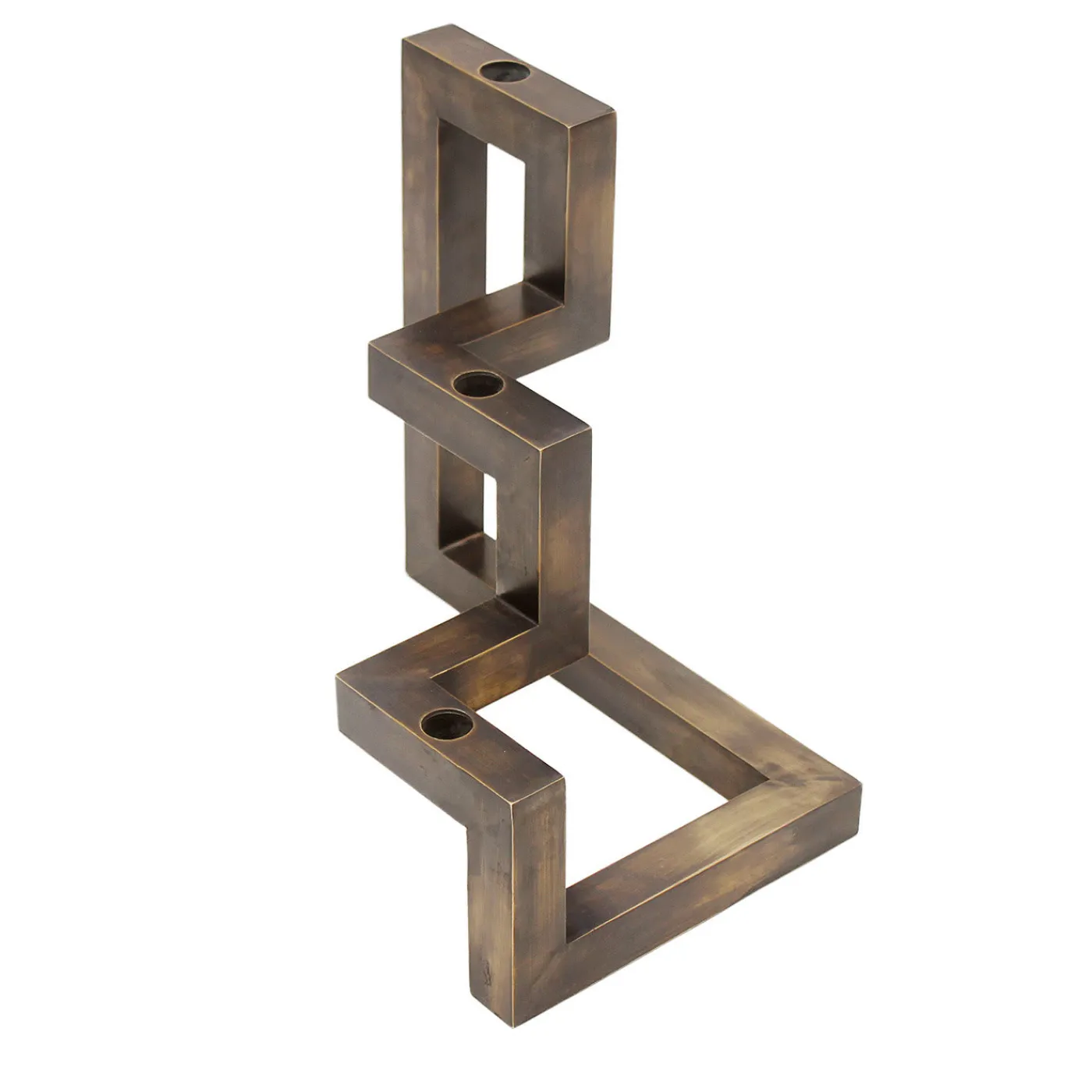 Questo candelabro a tre bracci su più livelli è un disegno di Francesco della Femina, eseguito con ottone bronzato da abili artigiani metallurgici nell’antica bottega di Rua Catalana a Napoli. Ogni braccio si trova a un’altezza diversa, dando movimento alla struttura, che è particolarmente adatta come centrotavola.