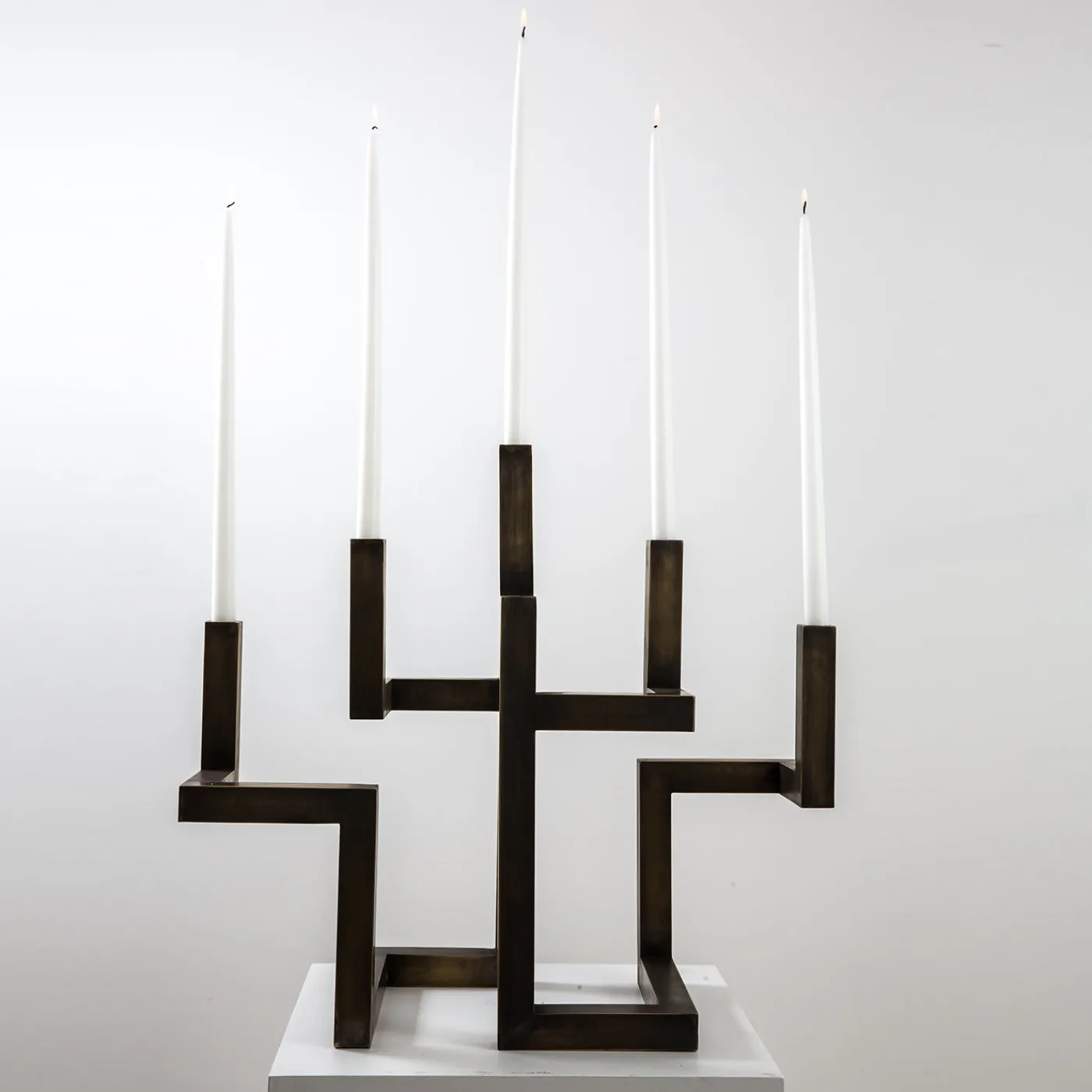 Candelabro a cinque bracci in ottone bronzato interamente realizzato a mano in Italia da abili artigiani nelle storiche botteghe di Rua Catalana a Napoli. La sua forma è una firma del designer napoletano Francesco Della Femina, che l’ha concepito come un centrotavola ornamentale versatile da abbinare agli stili degli interni.