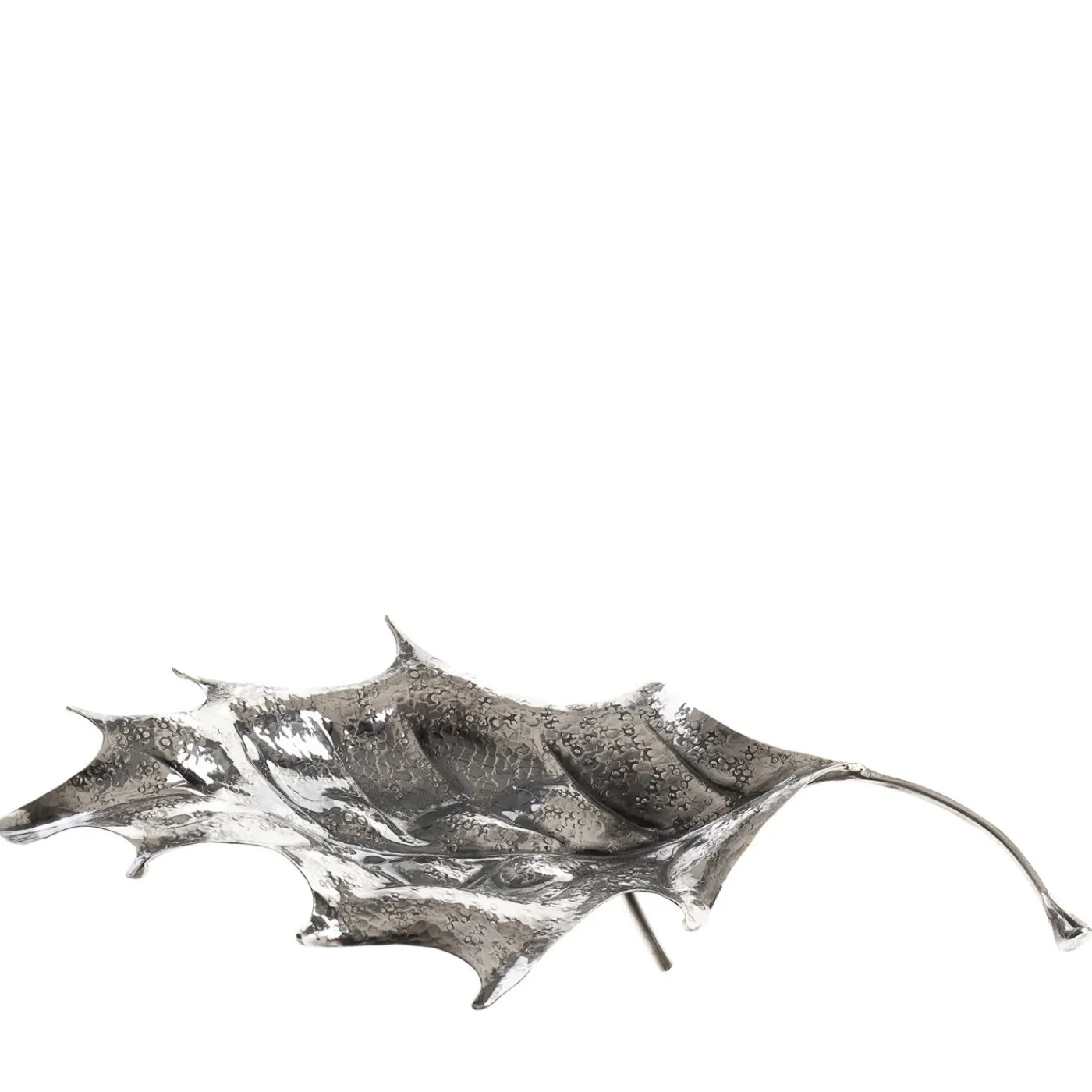 Singola foglia di agrifoglio in argento sterling scintillante. Questo squisito pezzo è stato sbalzato e inciso interamente a mano dai maestri argentieri della Fratelli Lisi, mostrando notevoli dettagli sulla lama, sulla nervatura centrale e sulle venature.