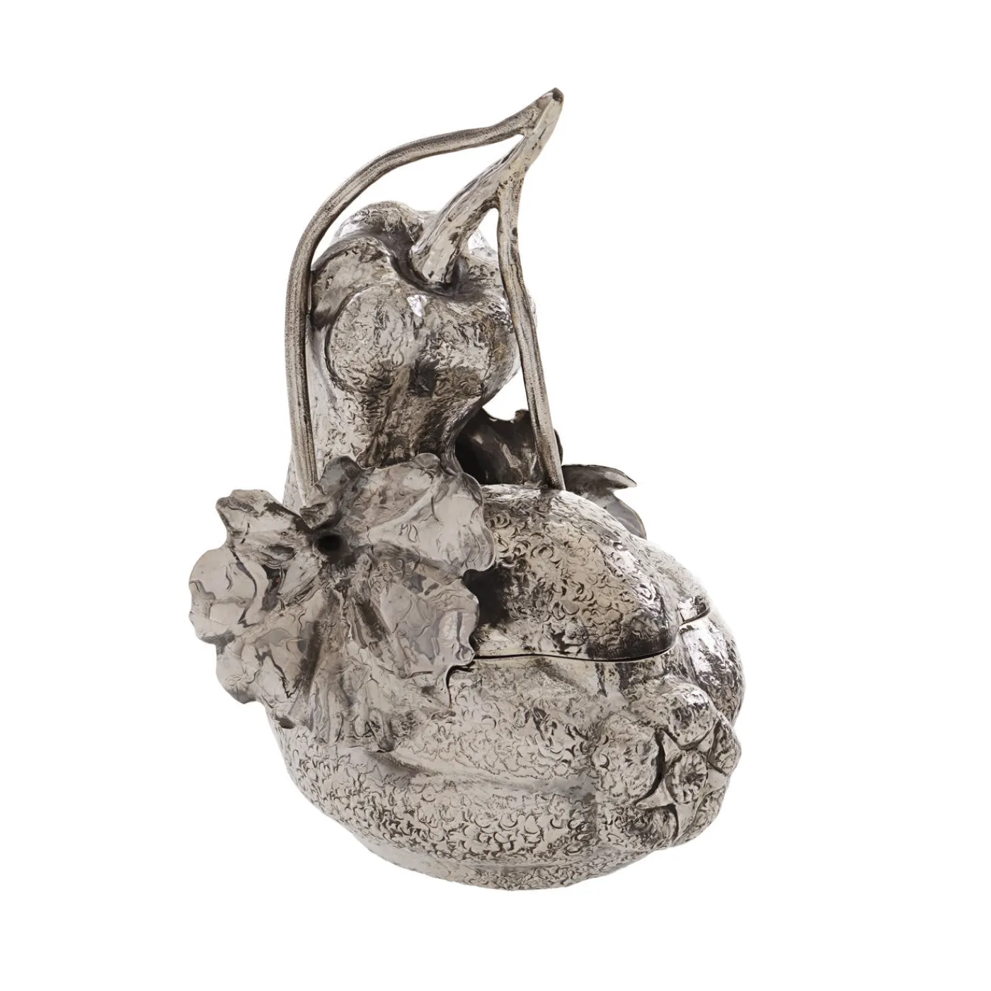 Scatola-zucca in argento 925 realizzata, cesellata e sbalzata a mano da esperti argentieri, i fratelli Lisi, a Firenze. La sua qualità dinamica e iperrealistica lo rende un prezioso oggetto d’arredo. L’interno è sfoderabile per una manutenzione facile e impeccabile.