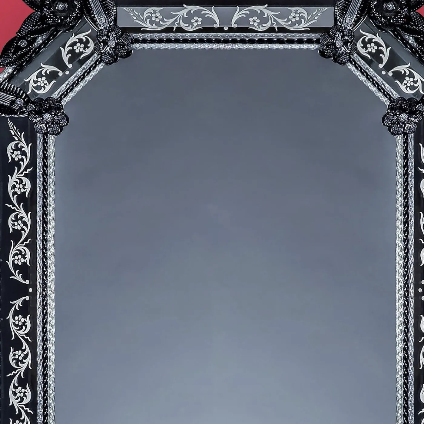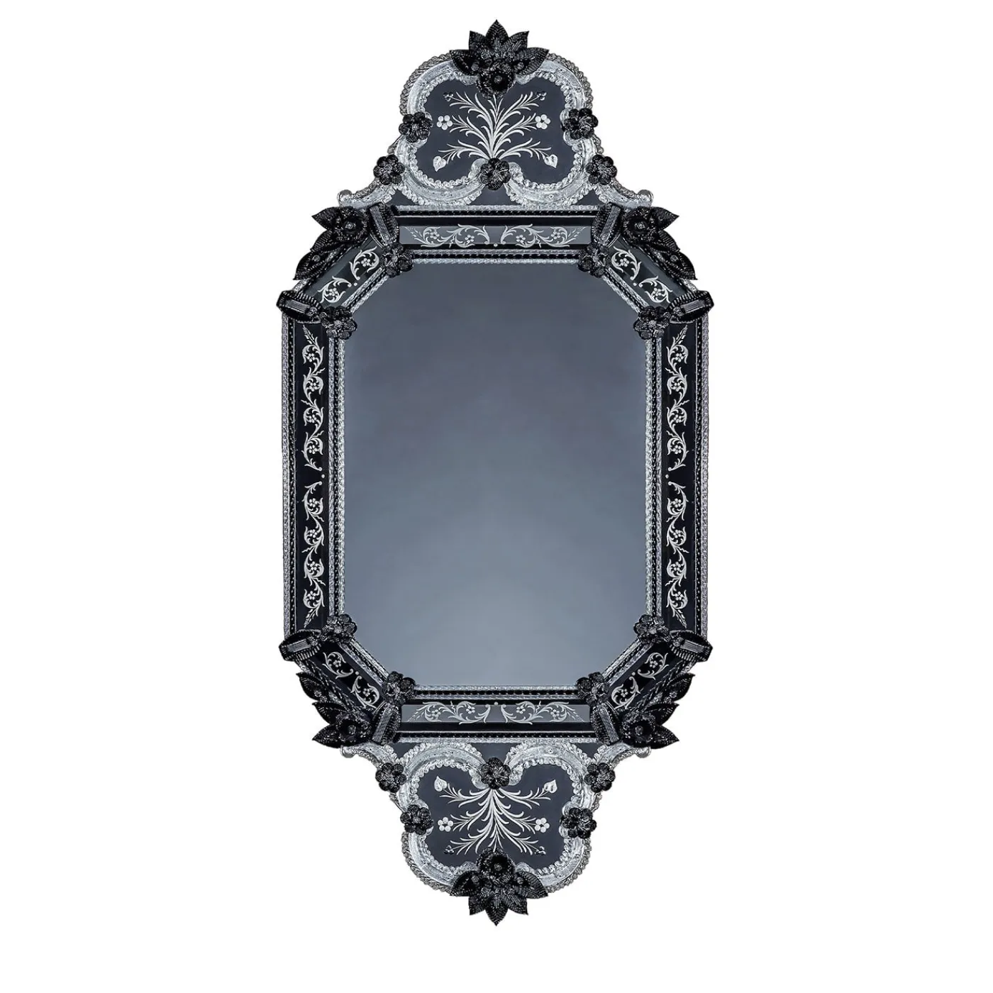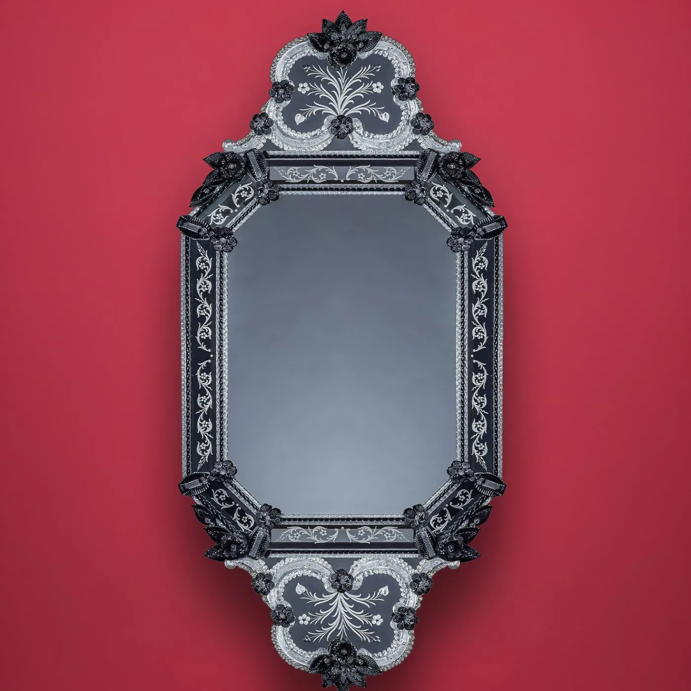 Specchio in vetro di Murano in stile veneziano, realizzato nel laboratorio dei Fratelli Tosi su disegno dei Fratelli Barbini Glass Mirror, interamente fatto a mano. Lo specchio è composto da un ottagono centrale con cornice in cristallo di Murano color argento e decorato con riccioli in vetro di Murano, il tutto su fondo argento, impreziosito da dettagli di foglie e fiori in vetro nero; lo specchio è tutto decorato con incisioni floreali e riccioli tutti realizzati interamente a mano.