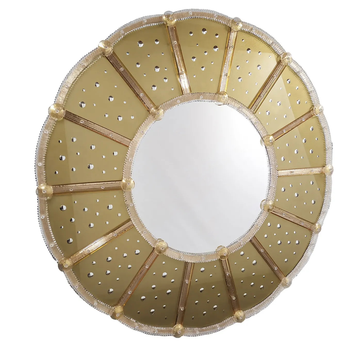 Splendidamente luminoso nei suoi dettagli dorati, bianchi, argentati e specchiati, questo magnifico specchio da parete prende il nome dalla parola italiana “Sole”. Simbolo di un raffinato stile tradizionale veneziano, è interamente realizzato a mano secondo antiche e durature tecniche artigianali, utilizzando vetro di Murano brillantemente colorato e modellato in diversi elementi di forte valore ornamentale.