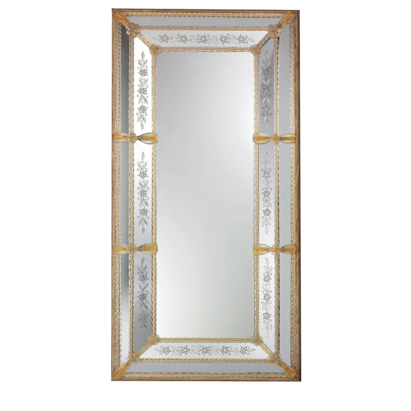 Questo superbo specchio fatto a mano spicca su qualsiasi parete, svolgendo contemporaneamente un ruolo decorativo e funzionale grazie al suo design ornato. I motivi floreali sono meticolosamente incisi nella sezione interna in vetro specchiato, la cui ispirazione naturalistica si abbina ai delicati inserti dorati in vetro di Murano che definiscono i bordi. Questo design sublime è stato ottenuto grazie ai maestri vetrai veneziani che eseguono con disinvoltura le tecniche del XIV secolo.