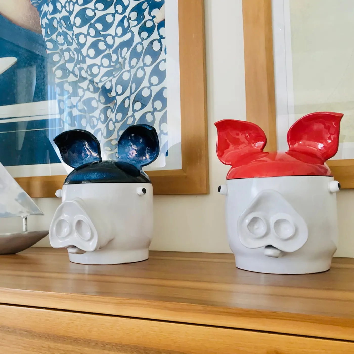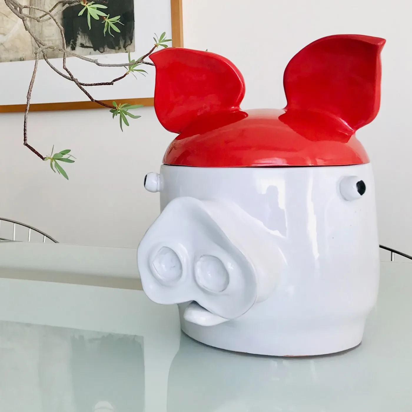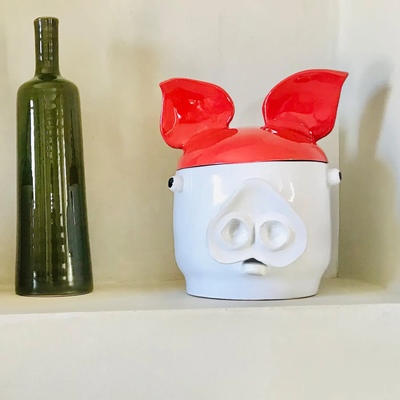 Il design zoomorfo di questo contenitore con coperchio rivela a prima vista il suo carattere eccentrico. Ideale per ravvivare le case moderne, questo pezzo artigianale segue la tecnica dell’arrotolamento e della maiolica, trasformando l’argilla in terracotta e sigillando poi gli smalti a 960° durante la seconda cottura. Le orecchie fungono da manici per il coperchio rosso, completando il corpo bianco caratterizzato da un muso protuberante. Si prega di verificare la versione piccola e gli altri colori con il Concierge.