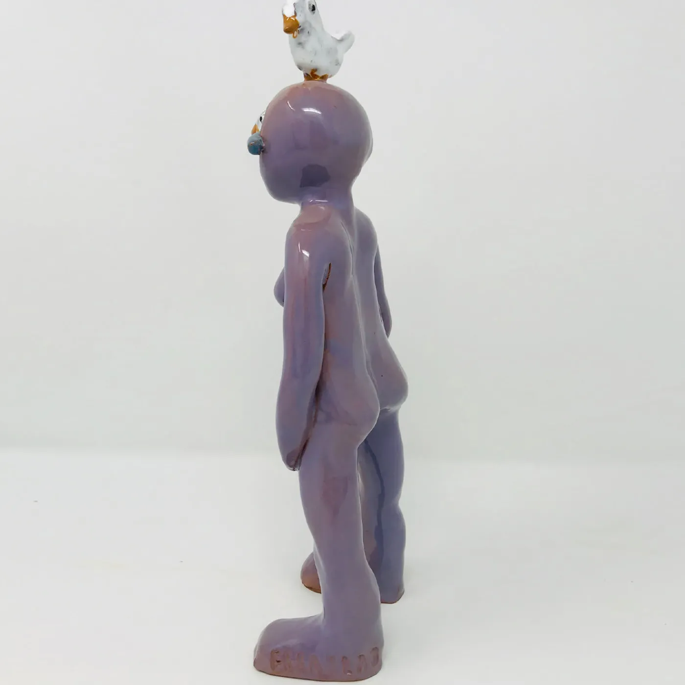 Modellata e rifinita a mano, questa singolare scultura in maiolica raffigura un palombaro in piedi con due gabbiani che sembrano invadere la sua figura senza vita. Appartiene alla Collezione Big Humans, una serie di pezzi antropomorfi provenienti da dimensioni visionarie. Meticolosamente scavato per evitare che si rompa durante la prima cottura a 960°C, il disegno viene successivamente cotto a 930°C per sigillare lo smalto lilla lucido. Si prega di informarsi presso il Concierge per le opzioni di personalizzazione disponibili.