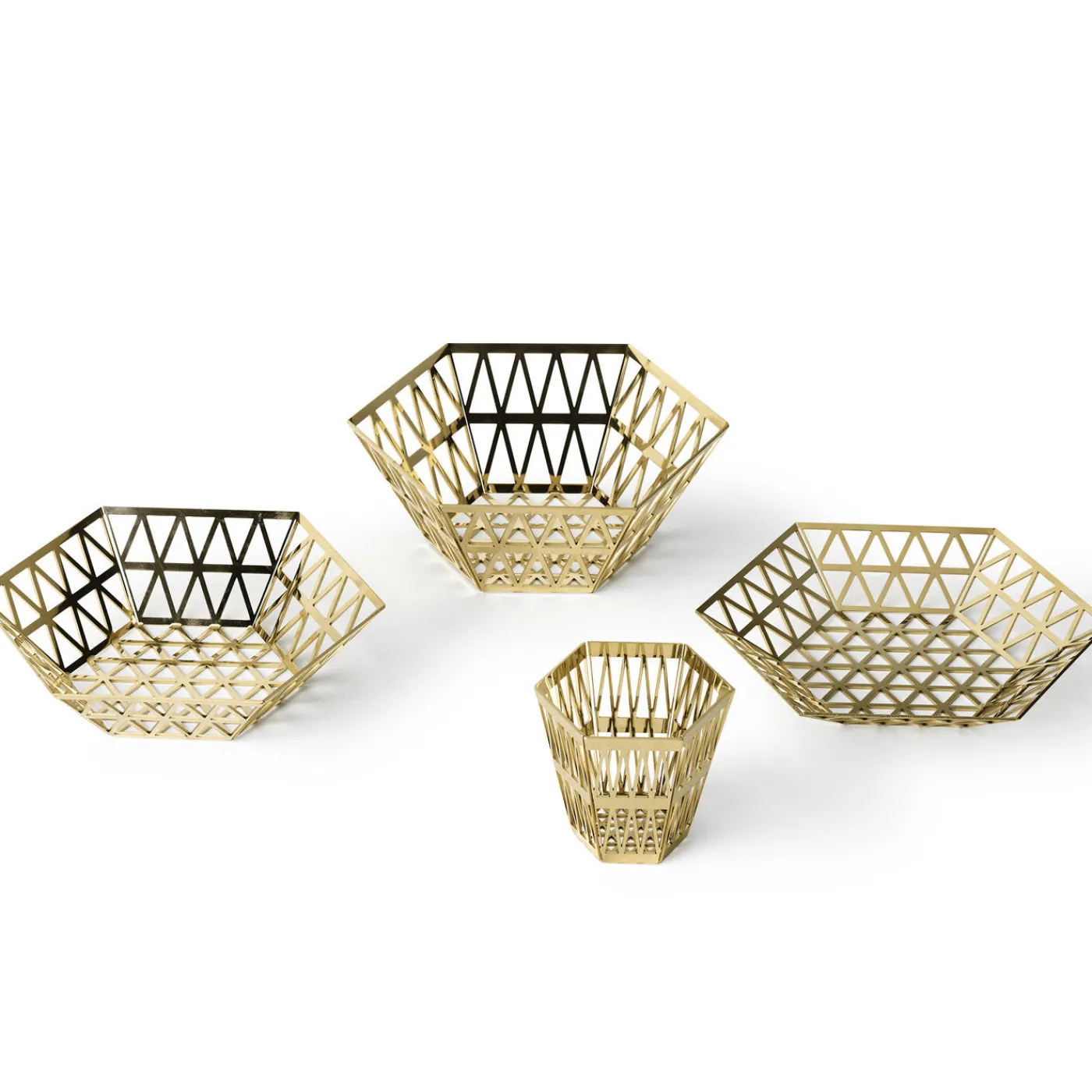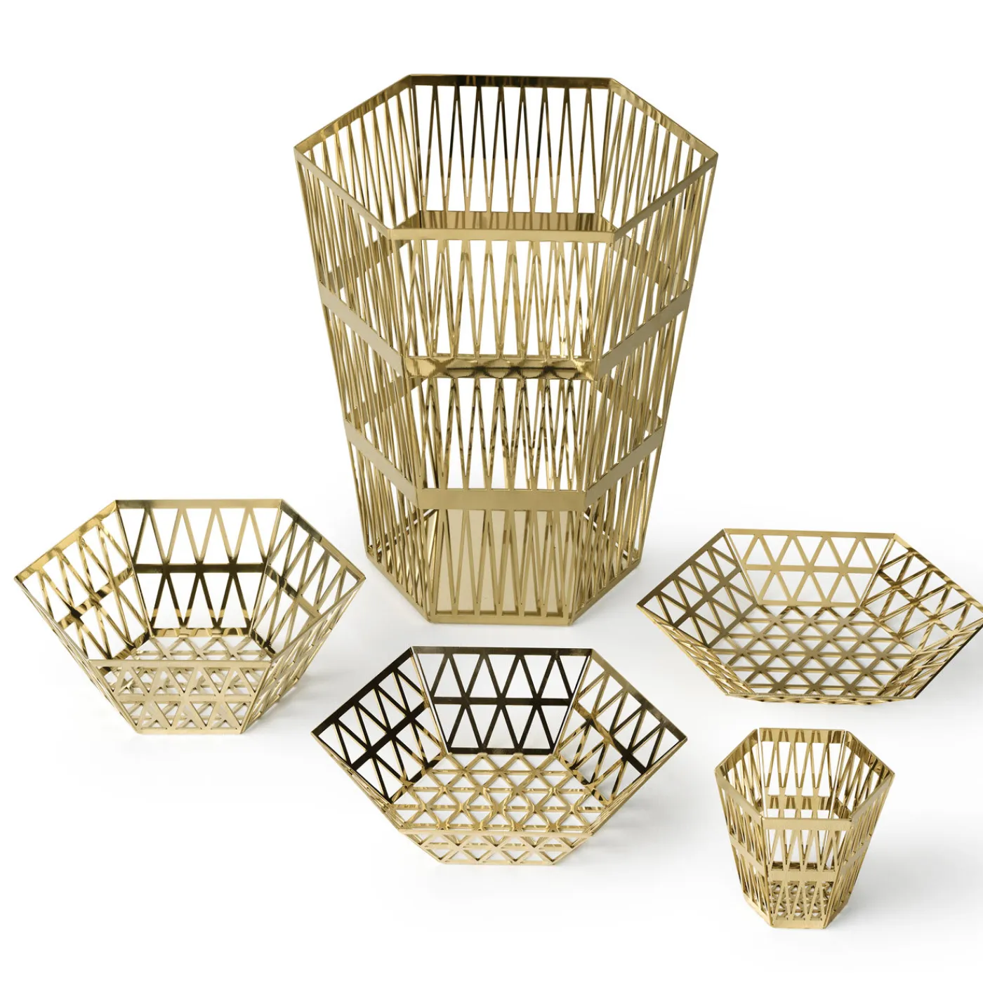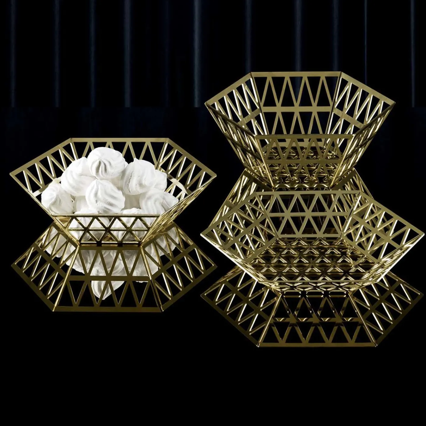 Questo elegante vassoio in acciaio inossidabile è stato progettato da Richard Hutten. Fa parte della serie Tip Top, composta da pezzi esagonali formati da strati di triangoli.
