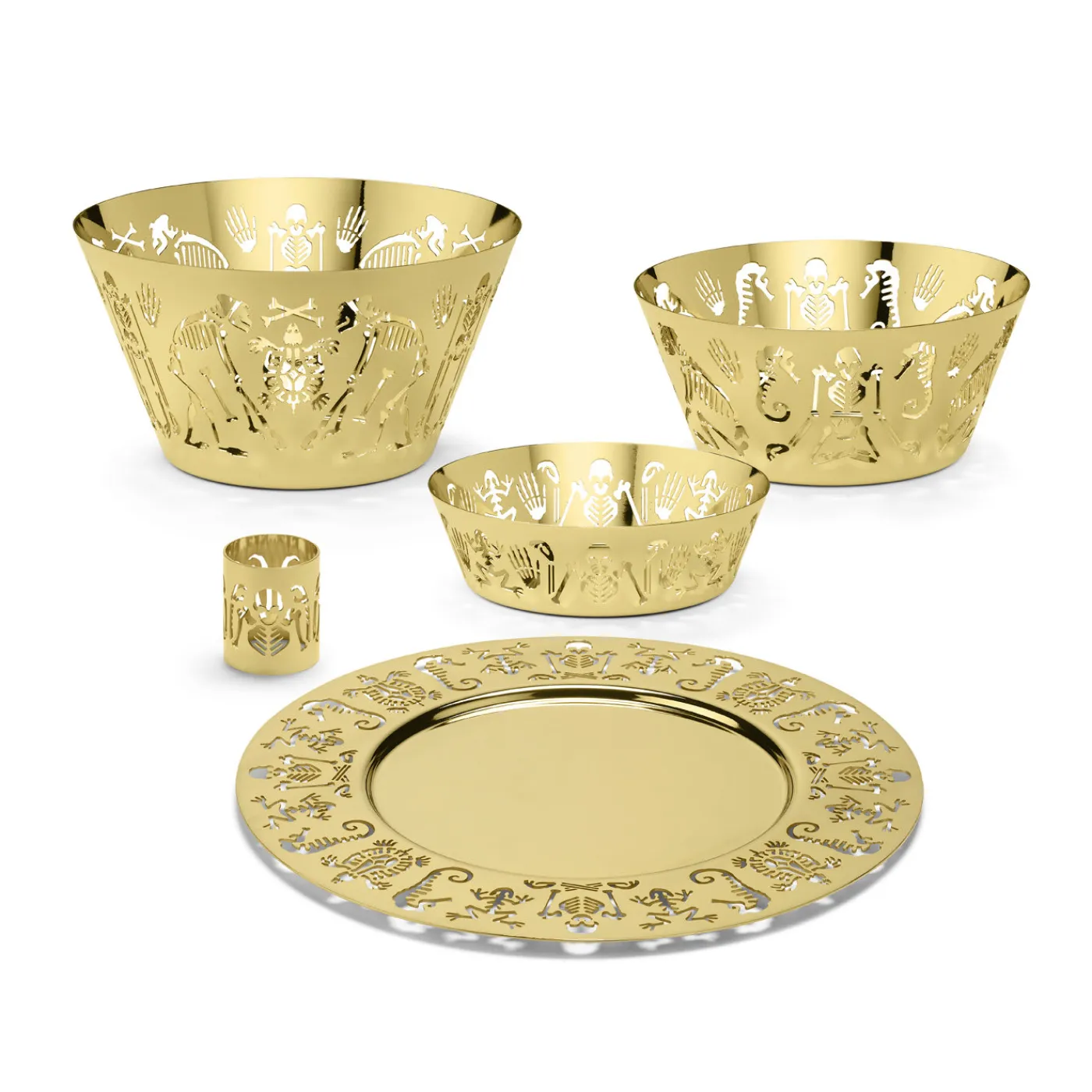 Parte della Collezione Perished, questa piccola ciotola è un superbo esempio di squisita fattura e sensibilità contemporanea. La forma svasata della ciotola è interamente realizzata in ottone e vanta una decorazione a intaglio che corre lungo i lati con scheletri danzanti di uomini e rane. Giocoso e sorprendente, questo pezzo sarà un ottimo espositore per piccoli oggetti su una console o una ciotola individuale per abbellire un tavolo moderno con un tocco unico. È possibile combinare questo pezzo con altri della stessa serie per ottenere un’estetica coesa.