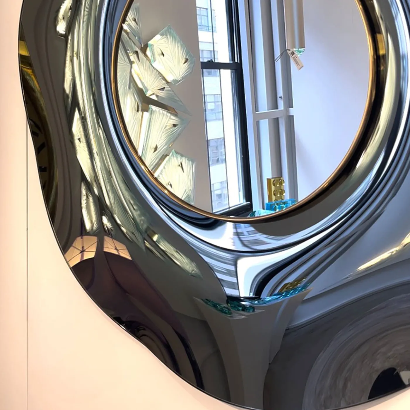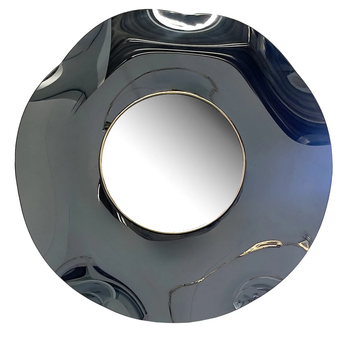 Lo specchio ondulato “Undulate” è un oggetto artistico di pura arte e design italiano. Il cristallo è stato lavorato a mano e sapientemente curvato dall’artista. La struttura di supporto è in legno e ottone. La sua forma circolare e le sue curve armoniose conferiscono leggerezza ed eleganza. La finitura è di colore grigio intenso “fume”. Ogni specchio è firmato. Diametro 39,4″