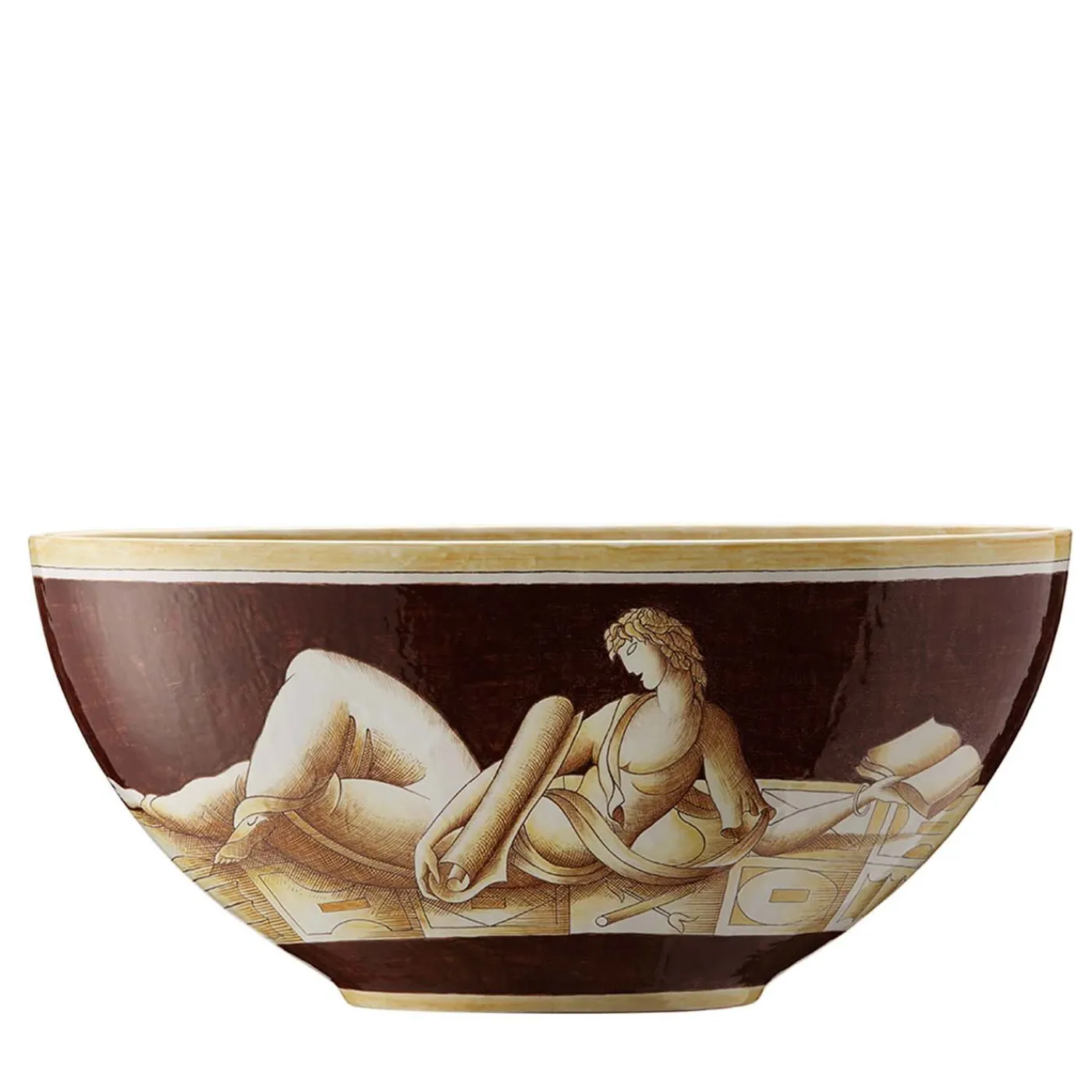 Su un pavimento piastrellato, una donna è raffigurata in una posa languida mentre legge da un libro e da un rotolo. Simboleggiando la combinazione di riferimenti classici e neoclassici di questa elegante collezione intitolata La Conversazione Classica, il soggetto di questa decorazione è La Lettura, l’incarnazione della lettura. Questa ciotola ovale è stata disegnata dal leggendario artista Gio Ponti nel periodo tra il 1923 e il 1933, quando era direttore artistico del marchio.