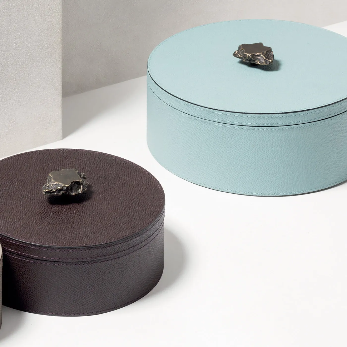 Questo sofisticato cofanetto, perfetto per riporre oggetti di valore, ninnoli o gioielli, sarà un regalo gradito per una persona cara. Realizzato a mano in pelle scamosciata blu chiaro, il coperchio rimovibile è impreziosito da un pomello in metallo con una calda finitura bronzo che rappresenta il motivo distintivo della collezione Ambretta.