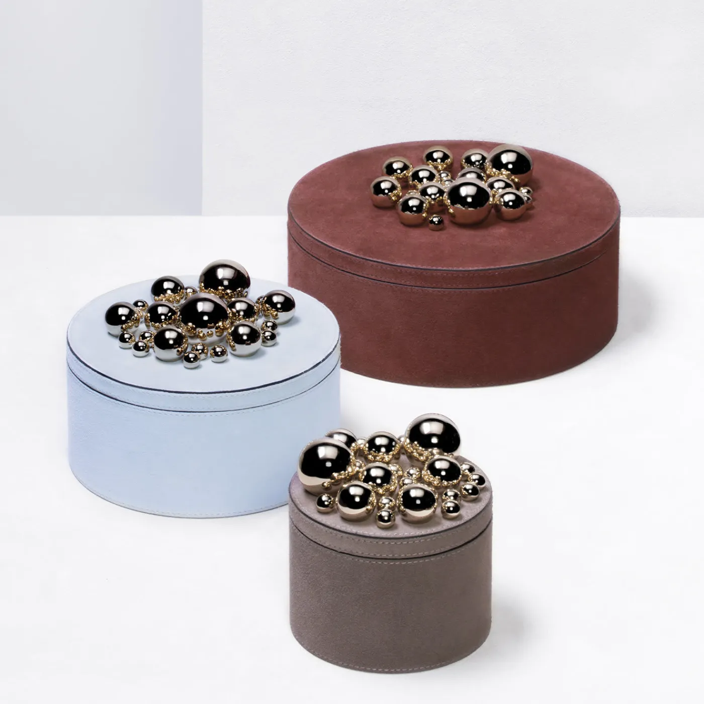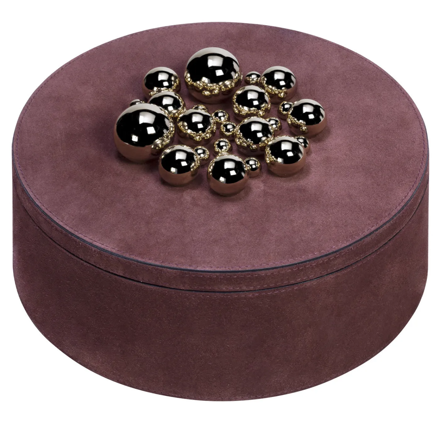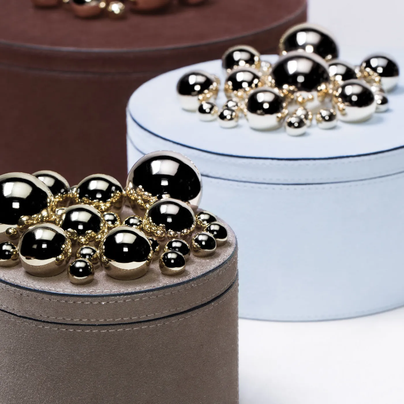 Realizzato in morbida pelle scamosciata, questo raffinato cofanetto custodisce con stile gingilli e gioielli. Il ricco colore bordeaux si abbina perfettamente al grappolo di sfere dorate che decorano la parte superiore del coperchio rimovibile e che rappresentano il tratto distintivo delle Champagne Sphérades disegnate da Stéphane Parmentier e ispirate all’architettura di Etienne-Louis Boullée e alle sculture surrealiste di Pol Bury.