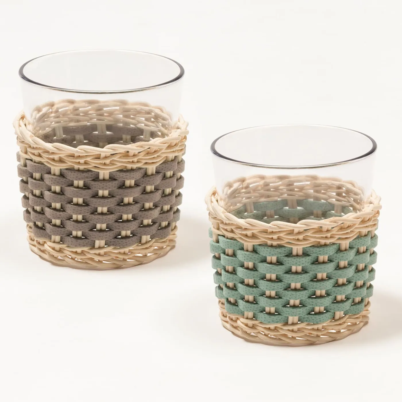 Vetro plastico trasparente parzialmente rivestito in pelle e rattan intrecciati. Il coperchio può essere rimosso per facilitare la pulizia. Disponibile solo con rattan naturale abbinato a golf o nappa.