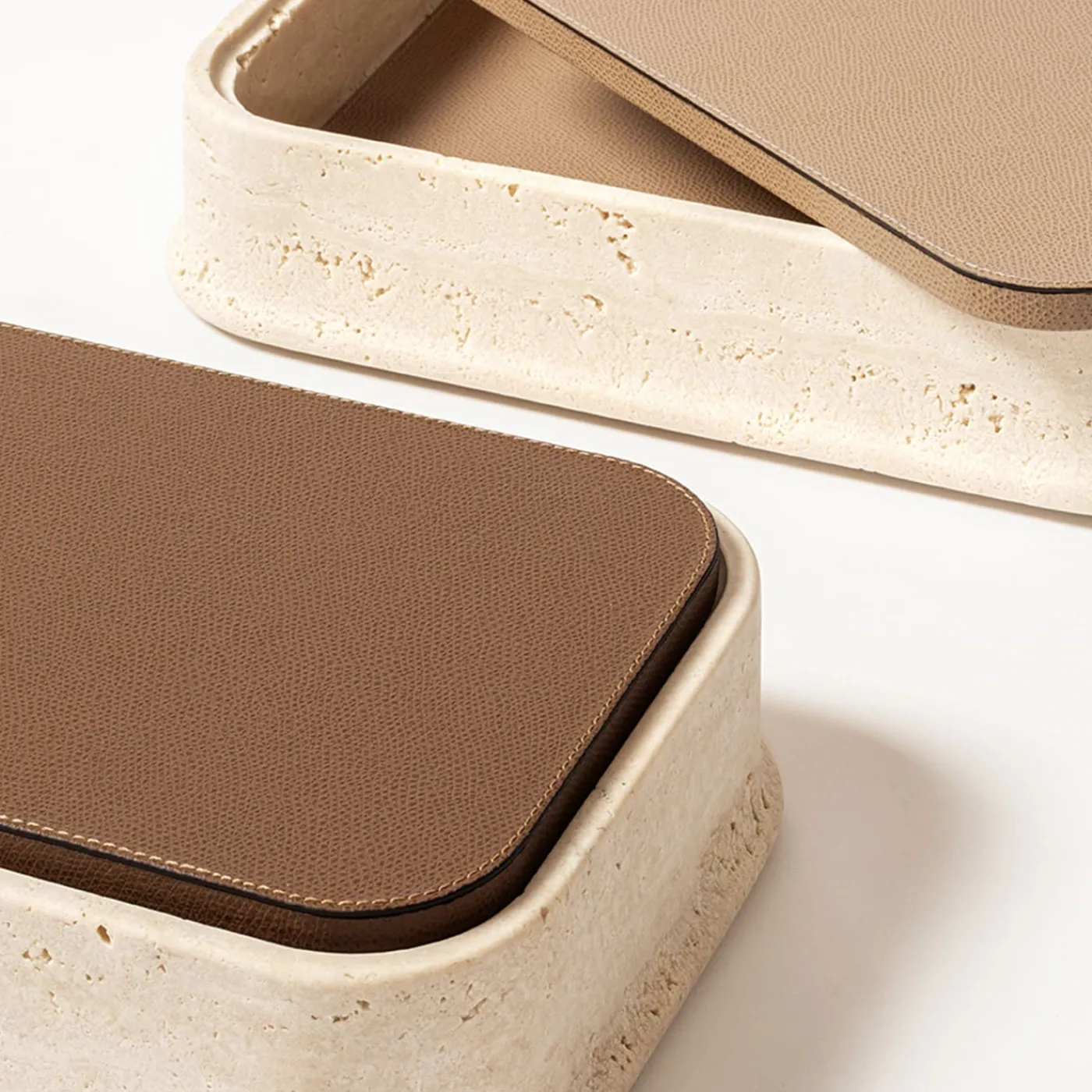 Le linee essenziali e i volumi morbidi di questa collezione esaltano appieno la bellezza del travertino. Disponibili in diverse nuance a scelta e dotate di tovagliette in pelle rimovibili, le scatole Rodi giocano con tinte unite e vuoti, contrasti di luce e abbinamenti di colore. Su richiesta sono disponibili misure personalizzate. Finiture Travertino disponibili: Travertino Classic, Travertino Noce, Travertino Titanio, Travertino Giallo, Travertino Rosso.