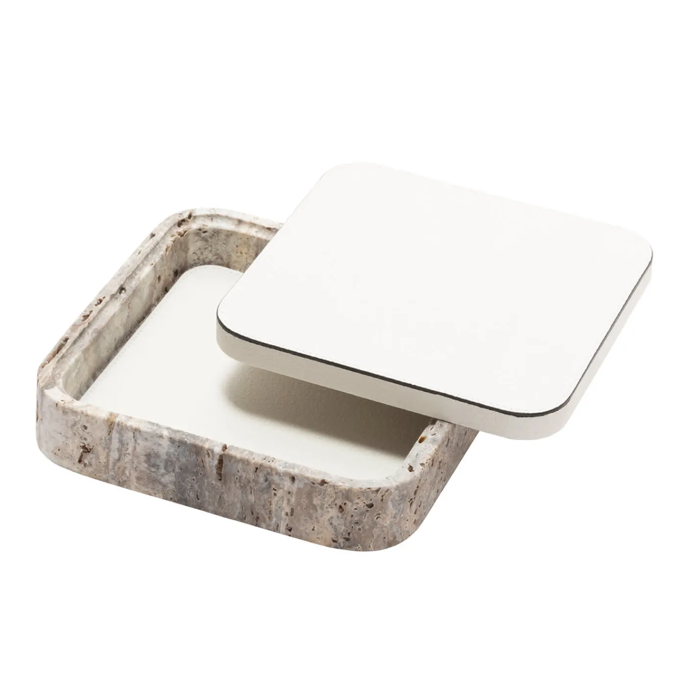 Caratterizzate da forme geometriche minimali, queste scatole combinano la bellezza del travertino in diverse sfumature di scelta con la migliore pelle italiana. Le dimensioni personalizzate sono disponibili su richiesta.