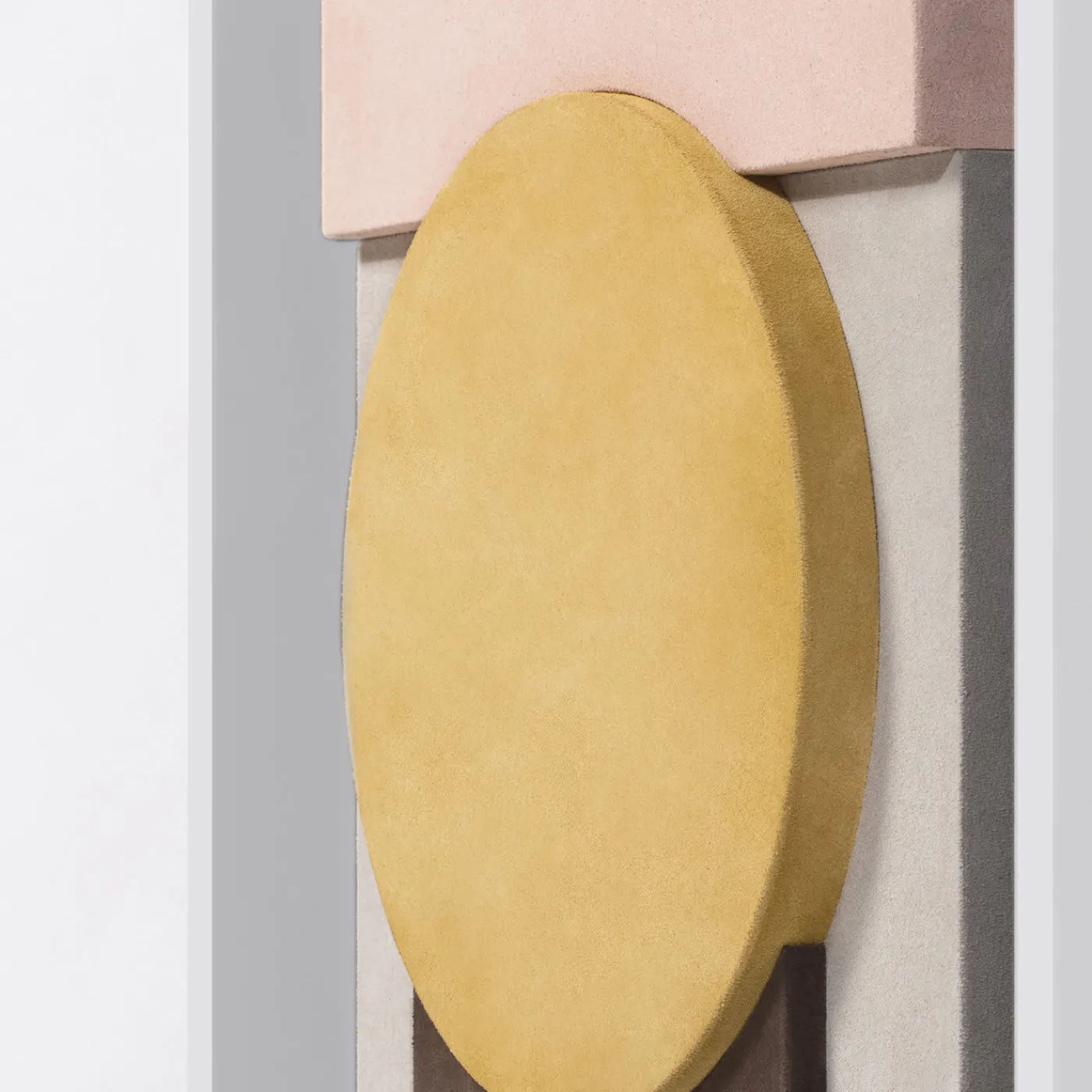 Questa scultura da parete astrattista si distingue per l’abile uso delle geometrie, creando un’opera d’arte architettonica per un arredamento contemporaneo o minimalista. Le forme geometriche sono rivestite in morbida pelle scamosciata, con un cerchio centrale arancione incorniciato da un marchio a forma di U in color tortora, una fascia superiore in rosa e una fascia inferiore in marrone scuro. Questa sobria ma elegante giustapposizione di forme e texture evidenzia una qualità visiva dinamica, esaltata dalla struttura in legno nappa bianca. Audace e versatile, questo pezzo infonderà drammaticità a qualsiasi arredamento minimalista.