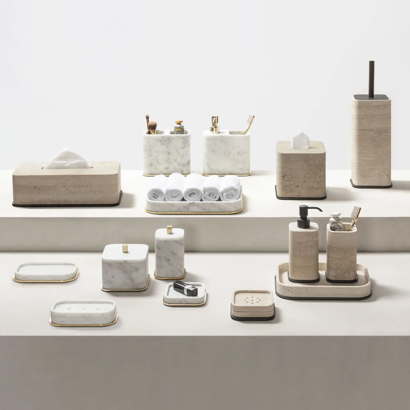 La collezione di bagni in marmo Polo presenta l’iconica silhouette con angoli arrotondati, caratteristica della famiglia di creazioni Polo, uno dei capisaldi del marchio, che aggiunge un tocco delicato a ogni pezzo e denota un gusto per il minimal e il geometrico. Ogni pietra utilizzata per dare vita a un set di marmo Polo è diversa dall’altra e conferisce un design unico ed esclusivo a ogni creazione. Su richiesta sono disponibili diverse finiture di marmo e metallo.