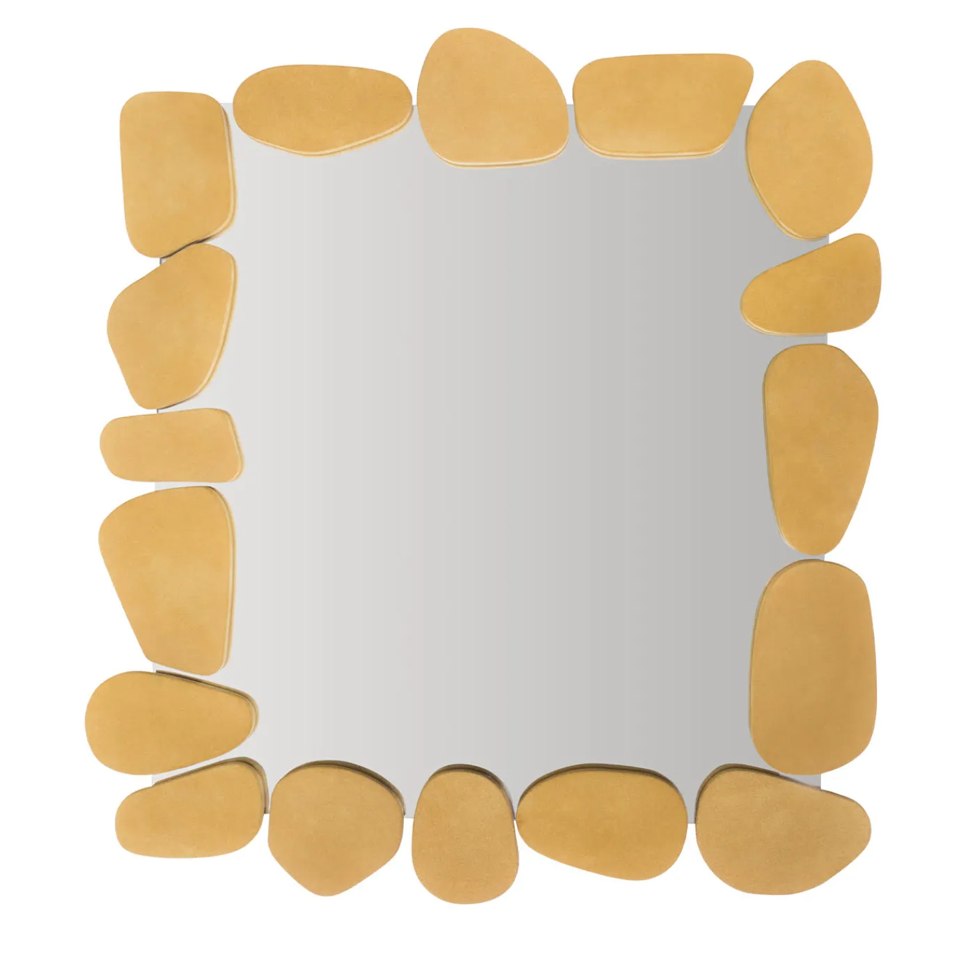 Abbinato a un arredamento eclettico e contemporaneo, questo specchio alla moda ravviva l’atmosfera di qualsiasi stanza. Gli accenti a forma di ciottoli incastonati nella cornice di legno sono rivestiti di pelle scamosciata giallo pallido per ricordare i tradizionali selciati dei villaggi di pescatori della Liguria, fonte di ispirazione per questo esclusivo progetto dell’architetto francese Stéphane Parmentier per Giobagnara.
