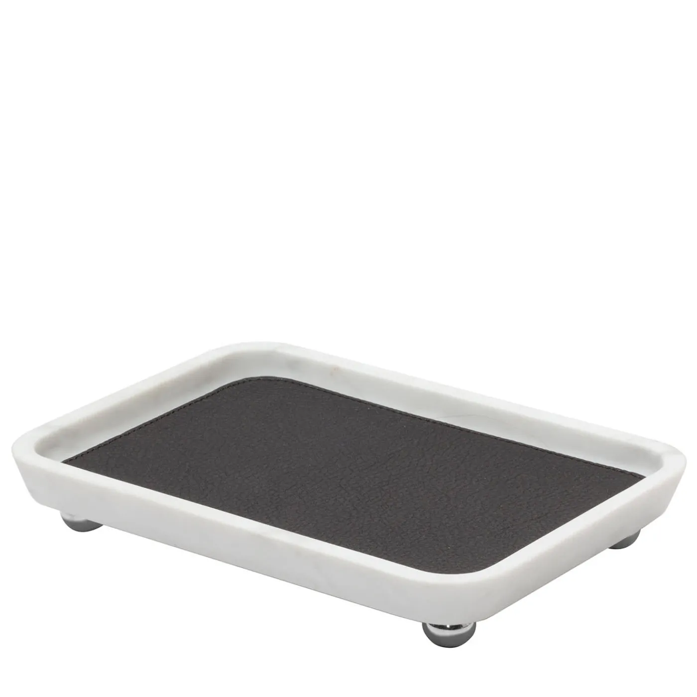 Struttura in marmo con piedi arrotondati in metallo disponibili in diverse finiture. Fornito con tovaglietta in pelle rimovibile. Finiture del marmo disponibili: Arabescato bianco / verde Guatemala / Eramosa marrone / nero Portoro / Travertino. Finiture in metallo disponibili: cromo / bronzo / ottone.