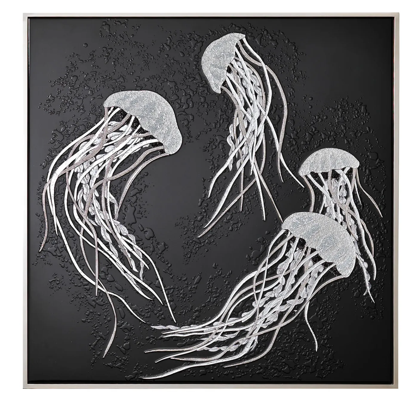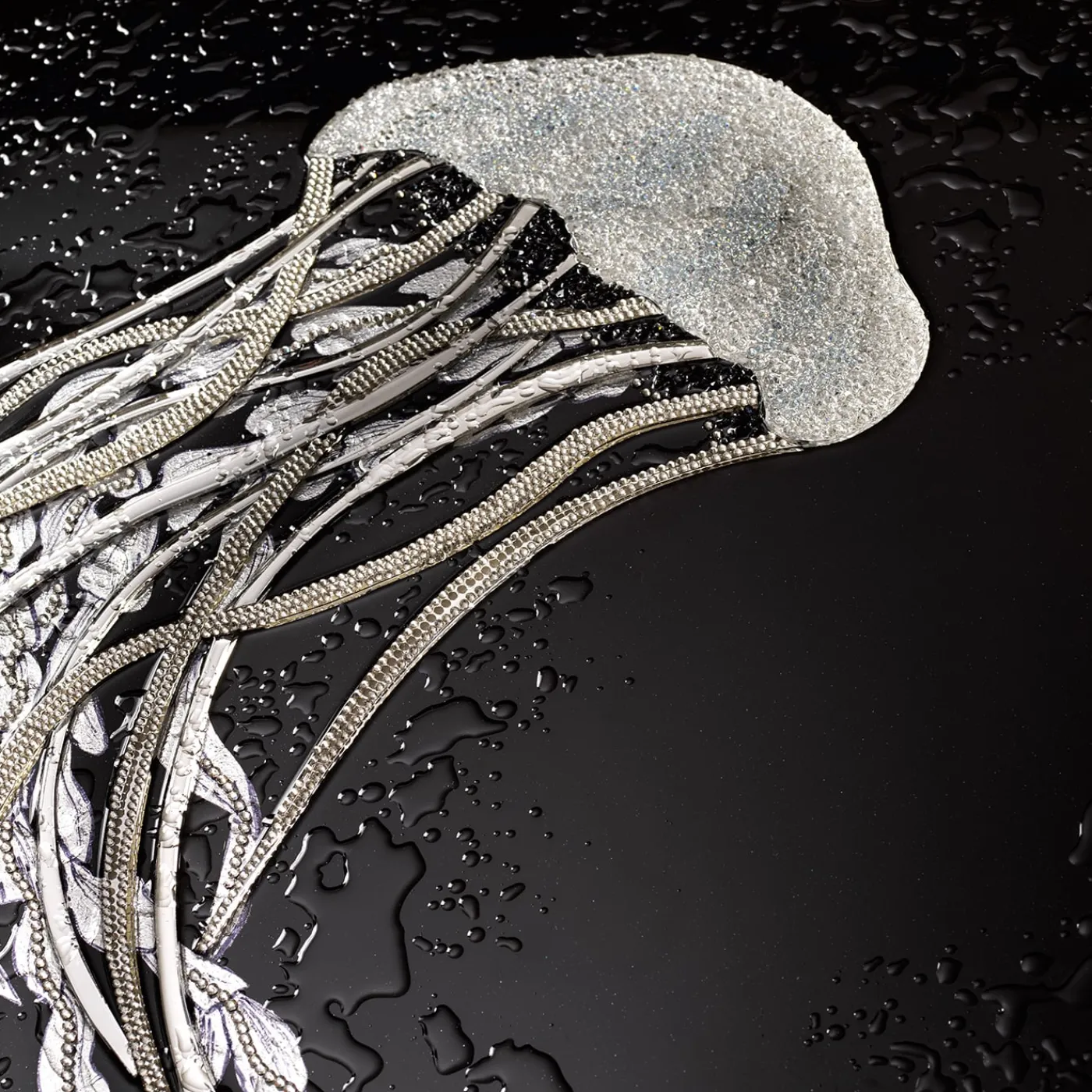 Scoprite questo quadro con struttura in legno e cornice in acciaio inox. Base in resina epossidica con protezione UV in combinazione con cristalli “Swarovski”, vetro a specchio trasparente tagliato a mano e foglie d’argento.