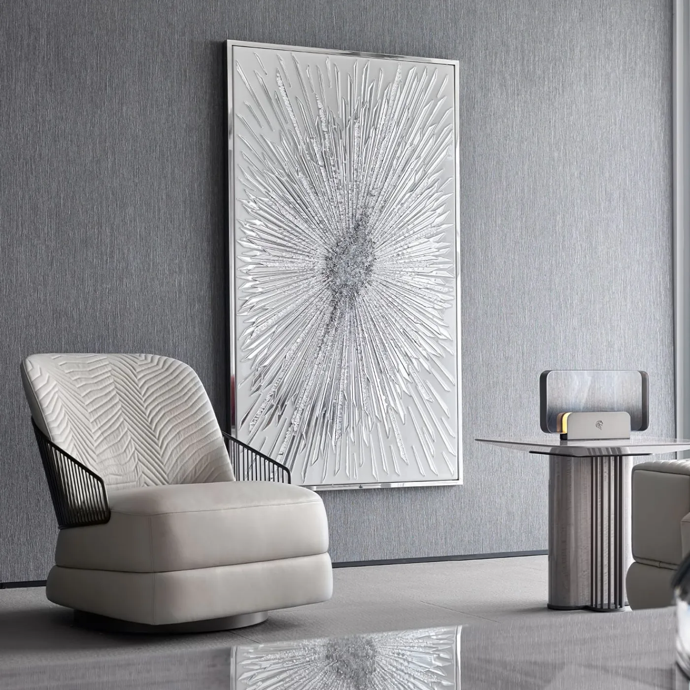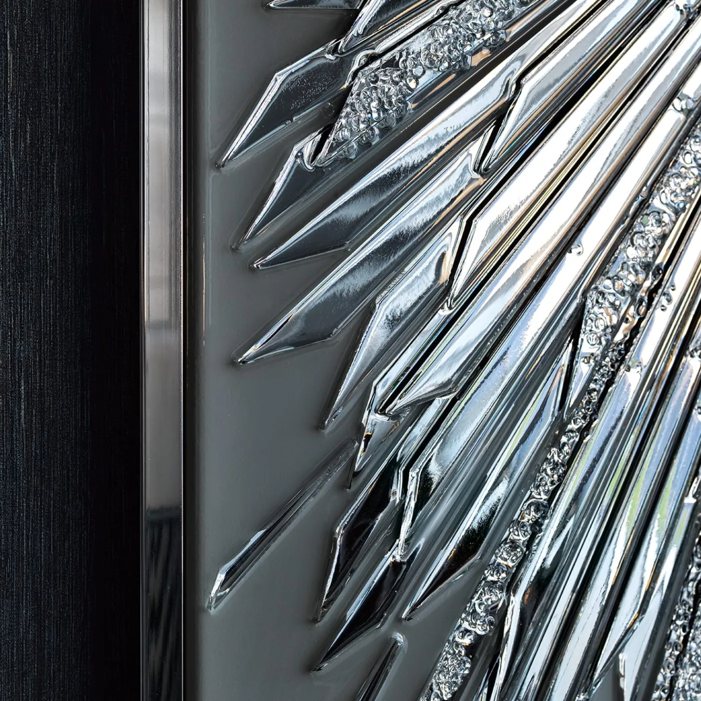 Scoprite questo quadro rettangolare con struttura in legno e cornice in acciaio inox. Base in resina epossidica con protezione UV in combinazione con cristalli “Swarovski” e vetro a specchio trasparente tagliato a mano.