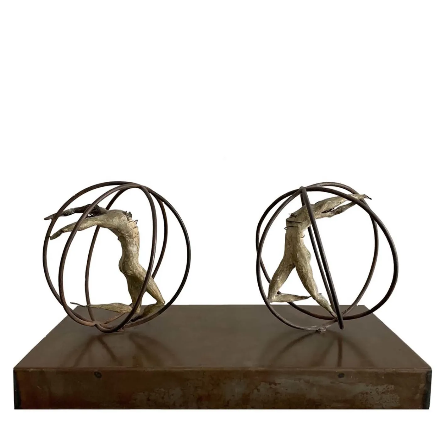 Incarnando la perfetta armonia tra artigianato tradizionale e sensibilità artistica contemporanea, questa scultura è una delle opere più apprezzate dell’artista. Realizzate a mano con l’antico metodo della cera persa, le due figure speculari sono realizzate in bronzo e danzano elegantemente in una sfera di ferro che può essere ruotata e spostata, creando sculture uniche e mutevoli.
