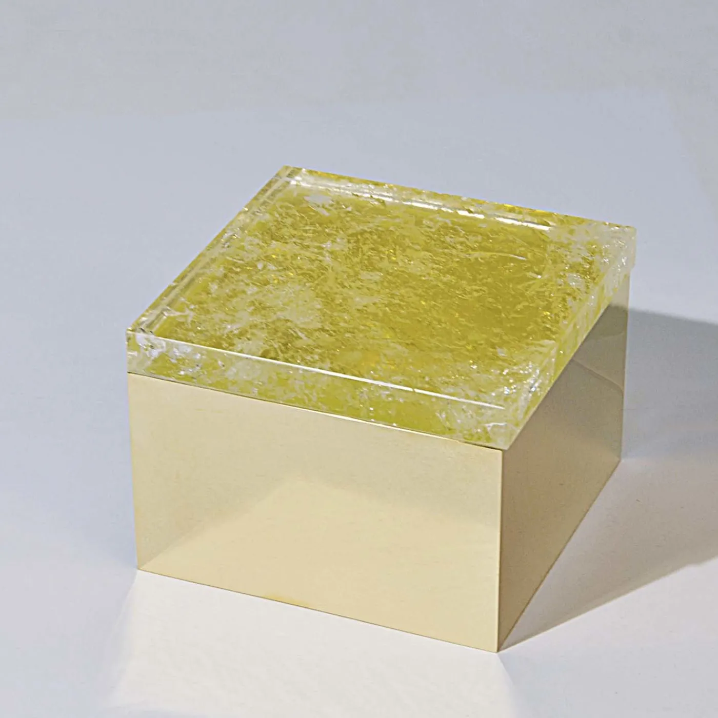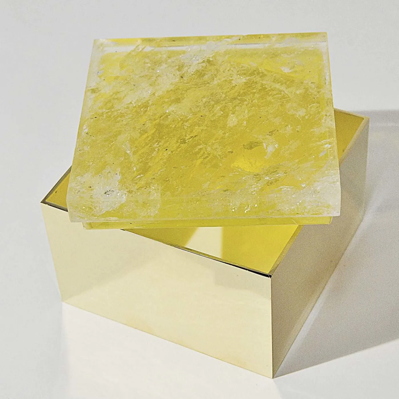 Unendo l’artigianato innovativo a materiali raffinati, questo elegante cofanetto è un oggetto scultoreo di lusso sobrio. La silhouette quadrata, realizzata in ottone dorato lucido, è caratterizzata da un caratteristico coperchio in vibrante quarzo giallo. Le ricche striature gialle del quarzo chiaro completano la finitura argentata della cornice in ottone dorato con un sorprendente contrasto visivo. Regalato, questo squisito pezzo porterà sicuramente un sorriso ai propri cari.