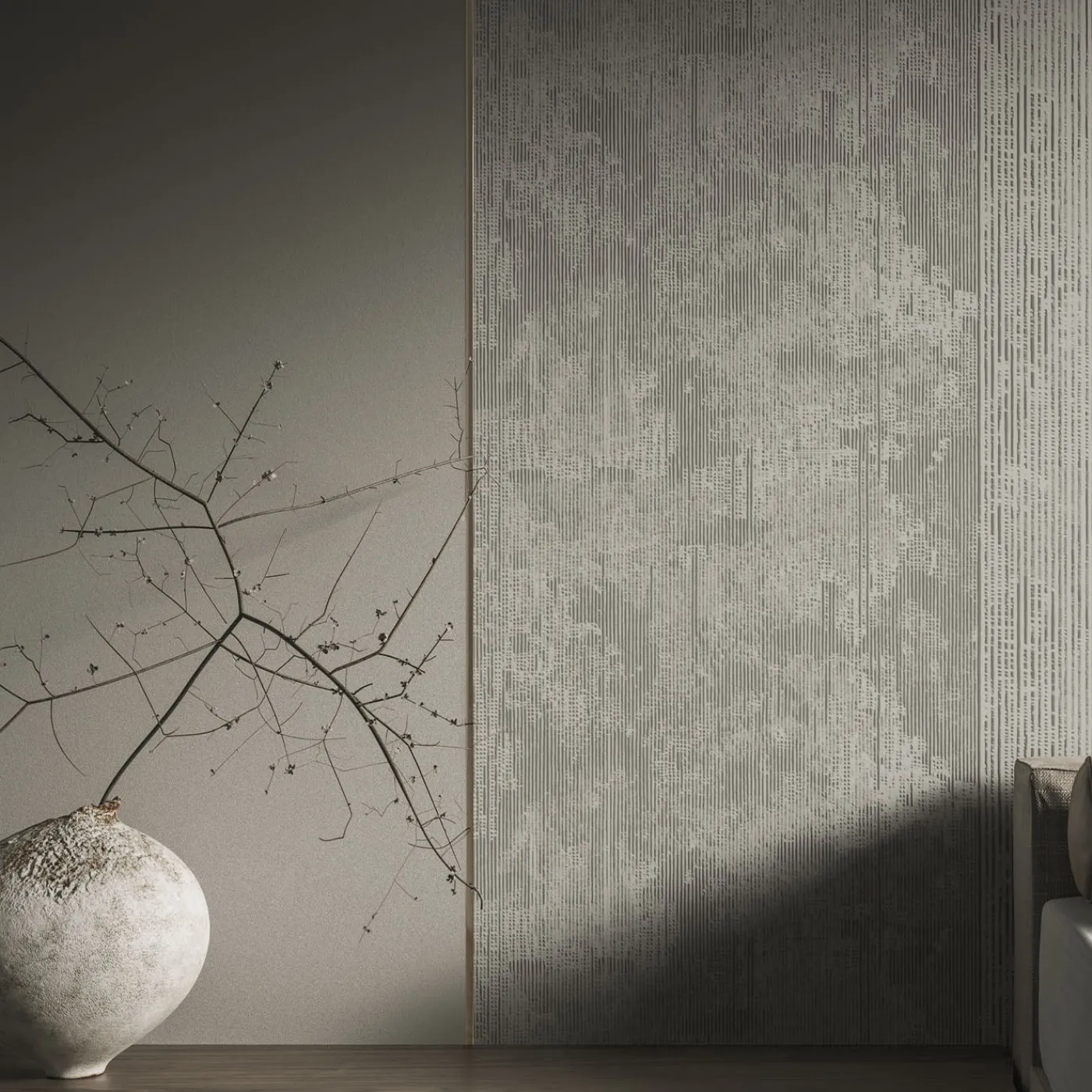 La carta da parati Rilievi, parte della collezione Tramae, presenta un motivo ritmico di scanalature verticali alternate, fini e spesse, evocando la texture dell’intonaco di calce invecchiato. Questo design crea un’architettura tattili sottile che migliora la percezione spaziale e aggiunge una continuazione elegante agli interni. Le sue delicate linee verticali introducono un senso di profondità e sofisticatezza senza tempo, rendendola una scelta raffinata per ambienti moderni e classici.