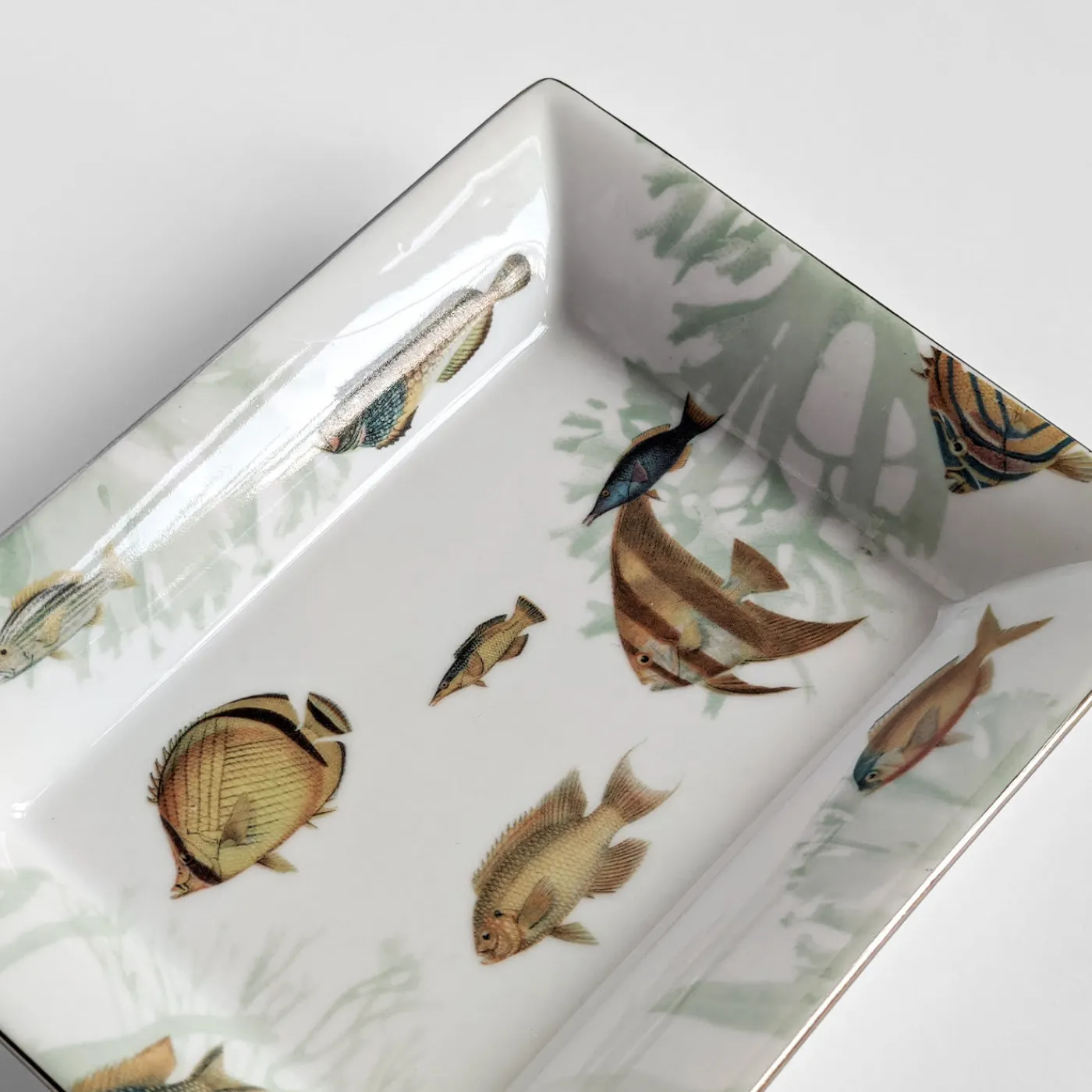 Questo splendido set di posacenere e videopoche coordinati, in fine porcellana bianca, sarà un regalo perfetto per le case costiere. Ispirato alla barriera corallina delle isole Amami in Giappone, il set raffigura pesci colorati dai dettagli raffinati su uno sfondo di alghe grigie. Il posacenere misura cm 15 x 11,5 x 2,5 H, mentre la vide-poche misura cm 19,5 x 16 x 4 H.