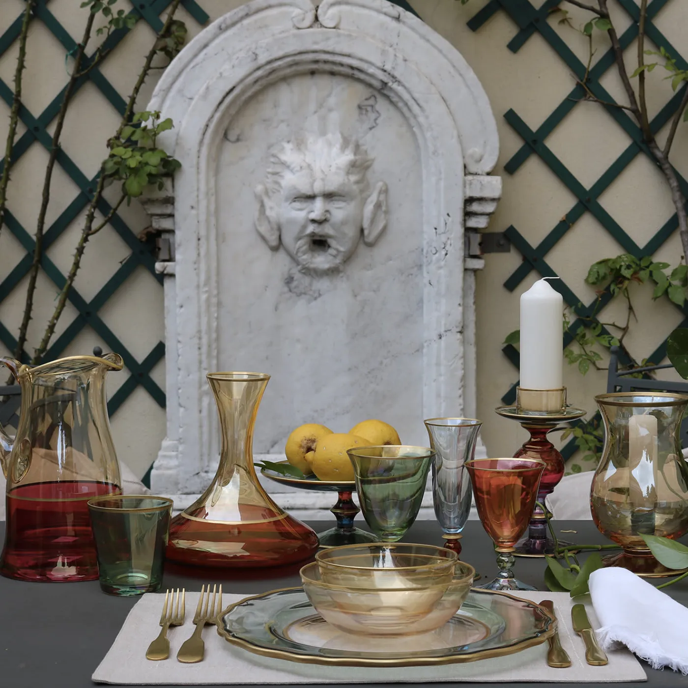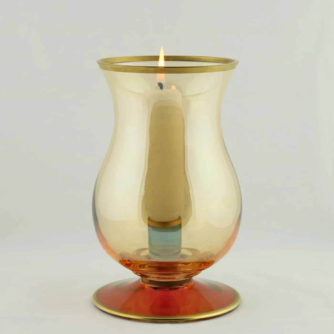 Questo sofisticato pezzo di arredamento funzionale è stato realizzato interamente in vetro con metodi artigianali e poi dipinto a mano con delicati colori pastello che aggiungono un tocco di fascino vivace alle sue dolci curve. Ideale come portacandele, questo contenitore poggia su una base con gambo corto di colore rosso, mentre il resto del corpo è di colore ambrato. Un bordo in oro zecchino nella parte superiore e inferiore conferisce al pezzo un aspetto lussuoso che arricchirà qualsiasi arredamento.