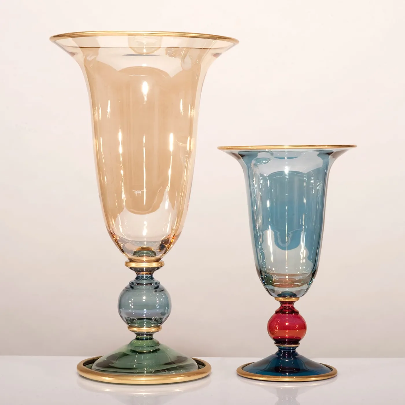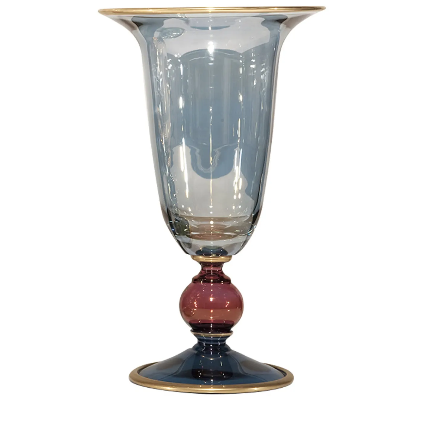 Questo vaso è stato interamente realizzato in vetro soffiato a bocca secondo tecniche artigianali e le sue curve sono evidenziate da delicati colori applicati a mano. Parte della collezione Arlecchino, questo pezzo può essere utilizzato da solo per esporre fiori freschi o secchi, oppure può essere abbinato ad altri per creare una composizione più dinamica. Una preziosa fascia in oro zecchino sottolinea il bordo superiore e inferiore e il gambo, aggiungendo una lussuosa luminosità al pezzo.