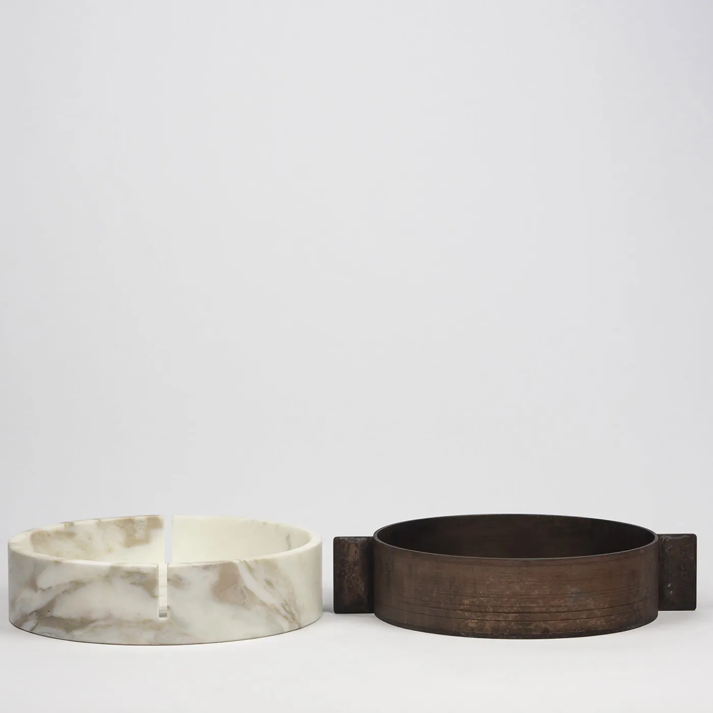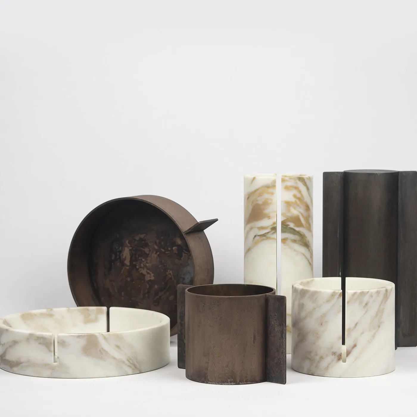 L’atto meccanico di aprire e chiudere permette o nega l’accesso a un luogo, a contenuti da proteggere, nascondere o tenere segreti. Questa collezione di contenitori, composta da elementi in marmo Calacatta Oro e pietra Jerissa e da elementi in metallo naturale e Corten, mette in relazione elementi che rappresentano il confine tra interno ed esterno, chiuso e aperto, privato e pubblico.